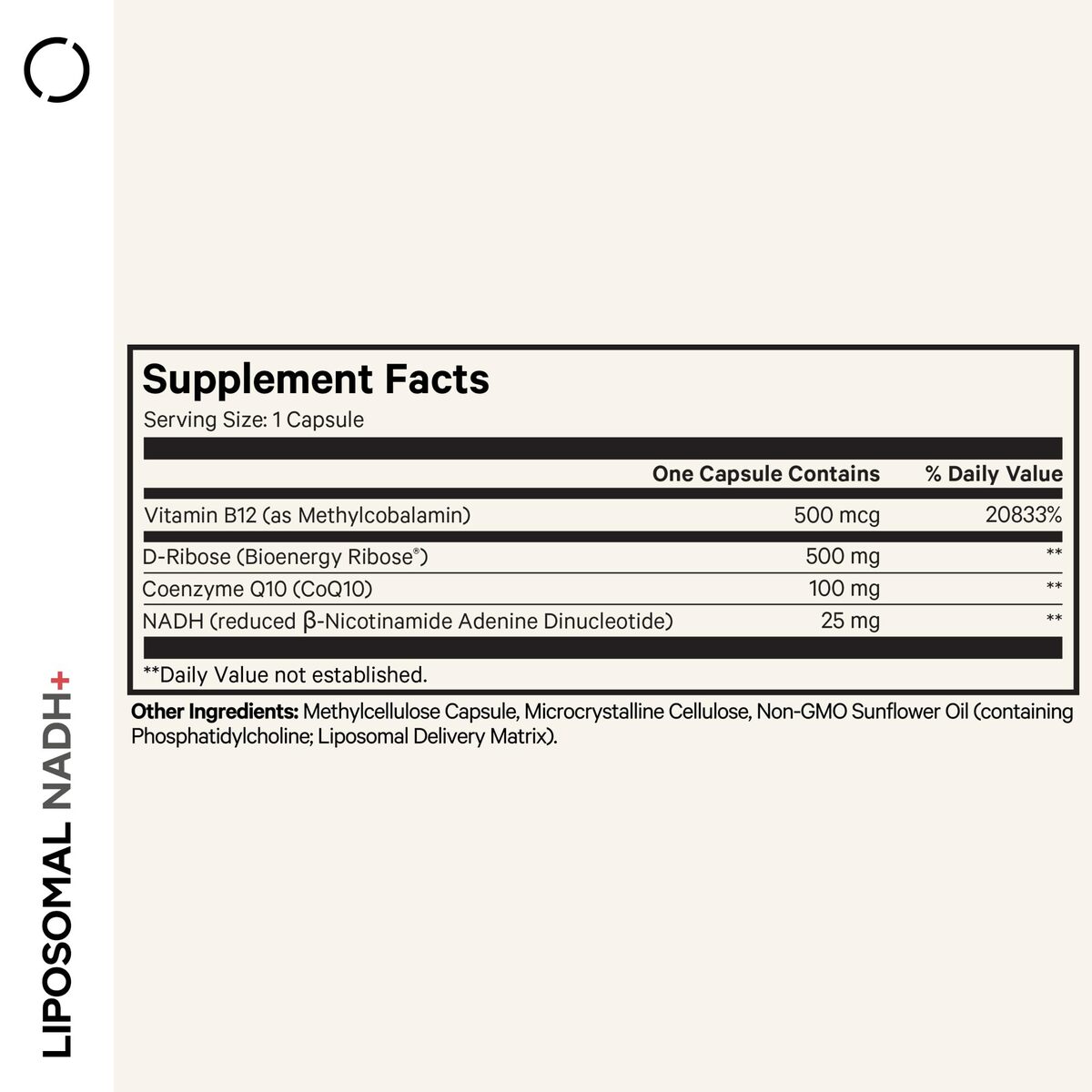 Comprehensive NADH Blend: Codeage Liposomal NADH+ supplement combines NADH (?-Nicotinamide Adenine Dinucleotide), Vitamin B12, D-Ribose (as Bioenergy Ribose), and Coenzyme Q10 in one convenient formula.,Advanced Liposomal Delivery: This NADH supplement features a liposomal delivery made with a phospholipid complex utilizing non-GMO sunflower oil for added purity.,2-Month Supply: Each bottle offers 60 servings per bottle, providing a 2-month supply. This NADH capsule supplement is convenient, with just one capsule per serving.,Dietary Friendly: This NADH pills supplement is non-GMO, dairy-free, soy-free, and gluten-free?suitable for various dietary needs and preferences.,Manufactured in the USA: Codeage Liposomal NADH+ Supplement is manufactured in the USA with global ingredients in a cGMP-certified facility for quality and purity. Each bottle offers a one-month supply.