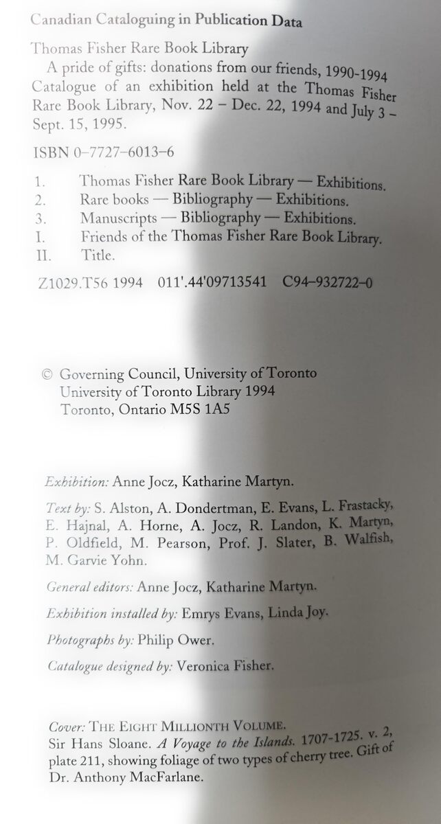 Discover the rich heritage of rare books and manuscripts through this exhibition catalog from the Thomas Fisher Rare Book Library. Published in 1994, this beautifully curated volume showcases significant donations received between 1990-1994. The catalog features detailed bibliographic information and descriptions of precious manuscripts and rare books, complemented by stunning photographs by Philip Ower. The cover artwork, taken from Sir Hans Sloane's 'A Voyage to the Islands' (1707-1725), displays elegant botanical illustrations of cherry tree foliage. This comprehensive catalog, with contributions from distinguished scholars and experts, provides invaluable insights into the library's expanding collection. Perfect for bibliophiles, researchers, and anyone interested in the preservation of literary treasures. ISBN 0-7727-6013-6.