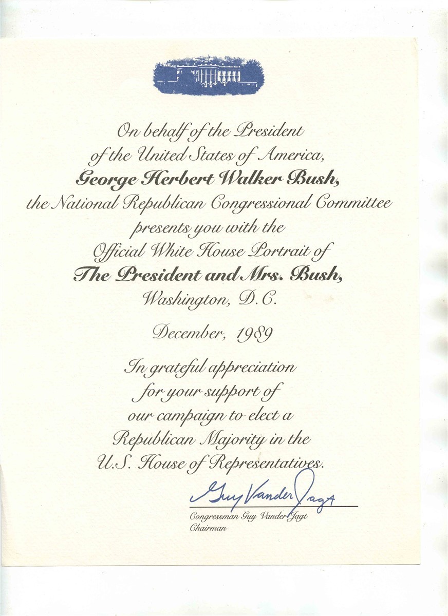 There are 2 items in this lot. A 7 1/4" x 10" color President George H W Bush and Mrs Bush Official Seasons Greetings Photo and A National; Republican Congressional Committee Certificate with the Official White House Portrait, from December 1989.