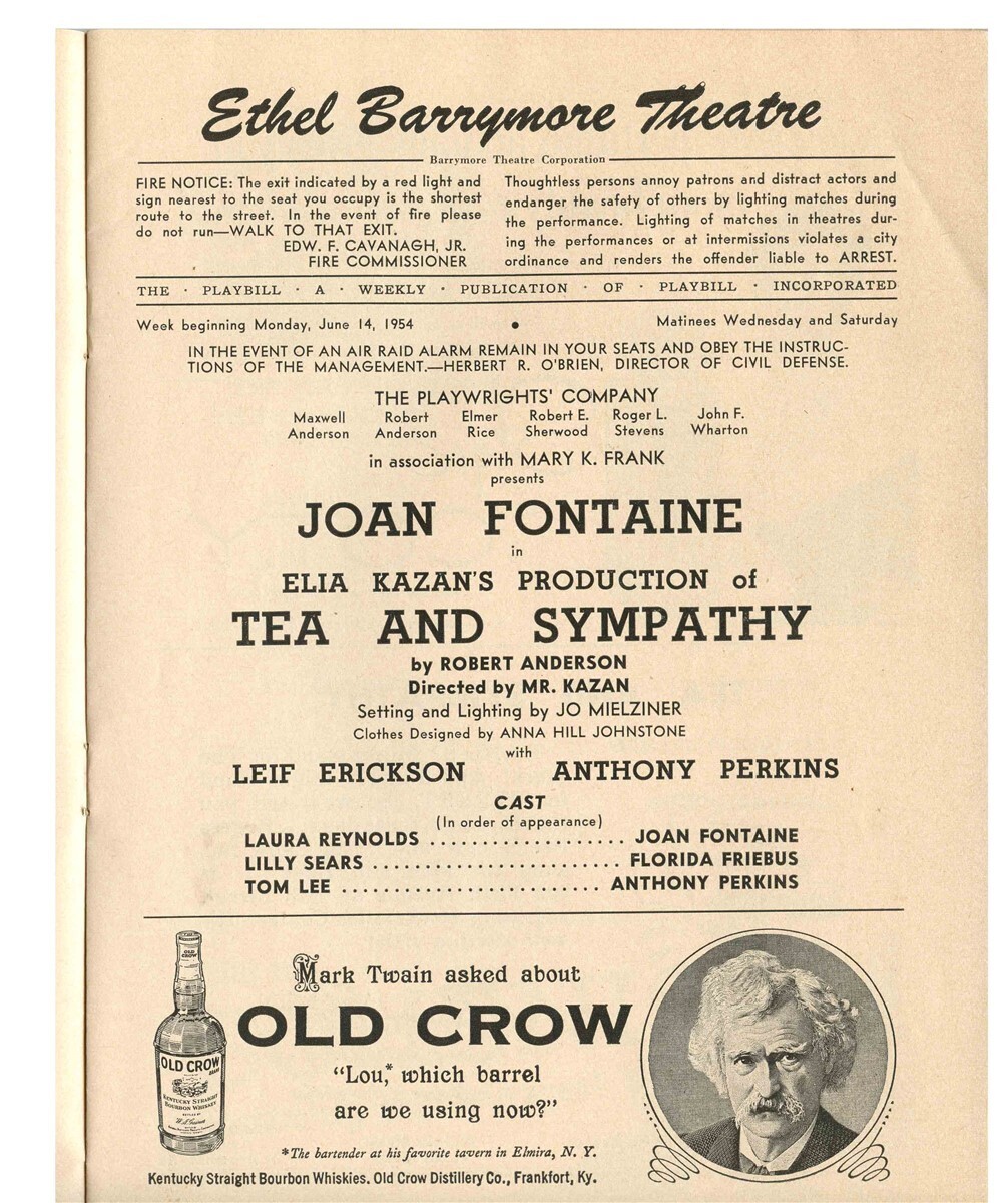 Playbill Tea and Sympathy 1954 Joan Fontaine Anthony Perkins Dick York