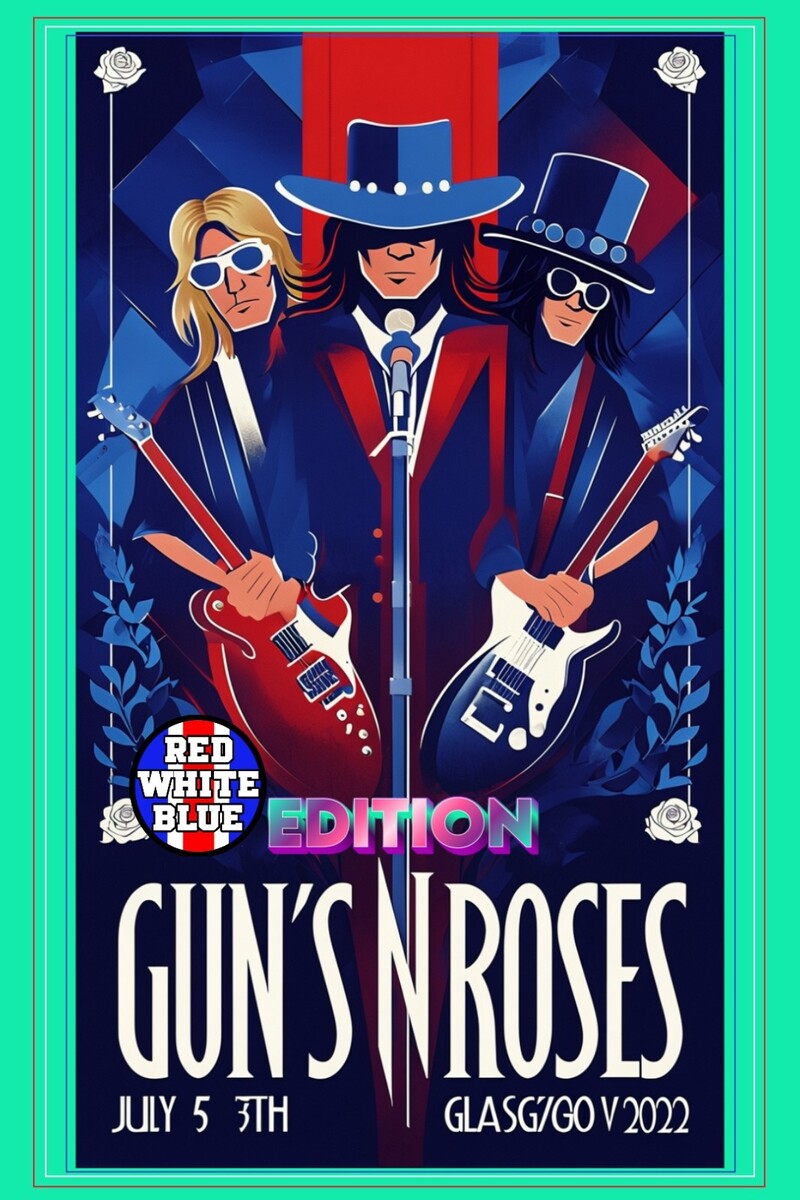The product is a RED, WHITE AND BLUE edition by Jaye Metcalfe 2022 GUN'S N ROSES poster San Francisco Grateful poster featuring the GUN'S N ROSES. This original poster, measuring 24x36 inches, was created in the United States and is a must-have for any music memorabilia collector. With only 300 copies in existence, this rock and pop genre poster captures the essence of the iconic band and their loyal fans