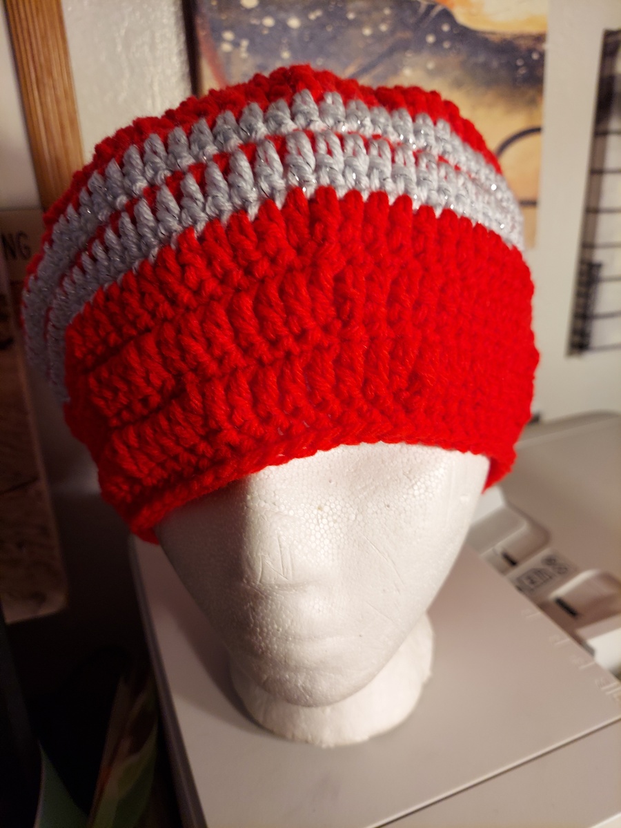 Sparkling Hearts, hand crocheted beanie, 9 inches deep, 10 1/2 inches wide