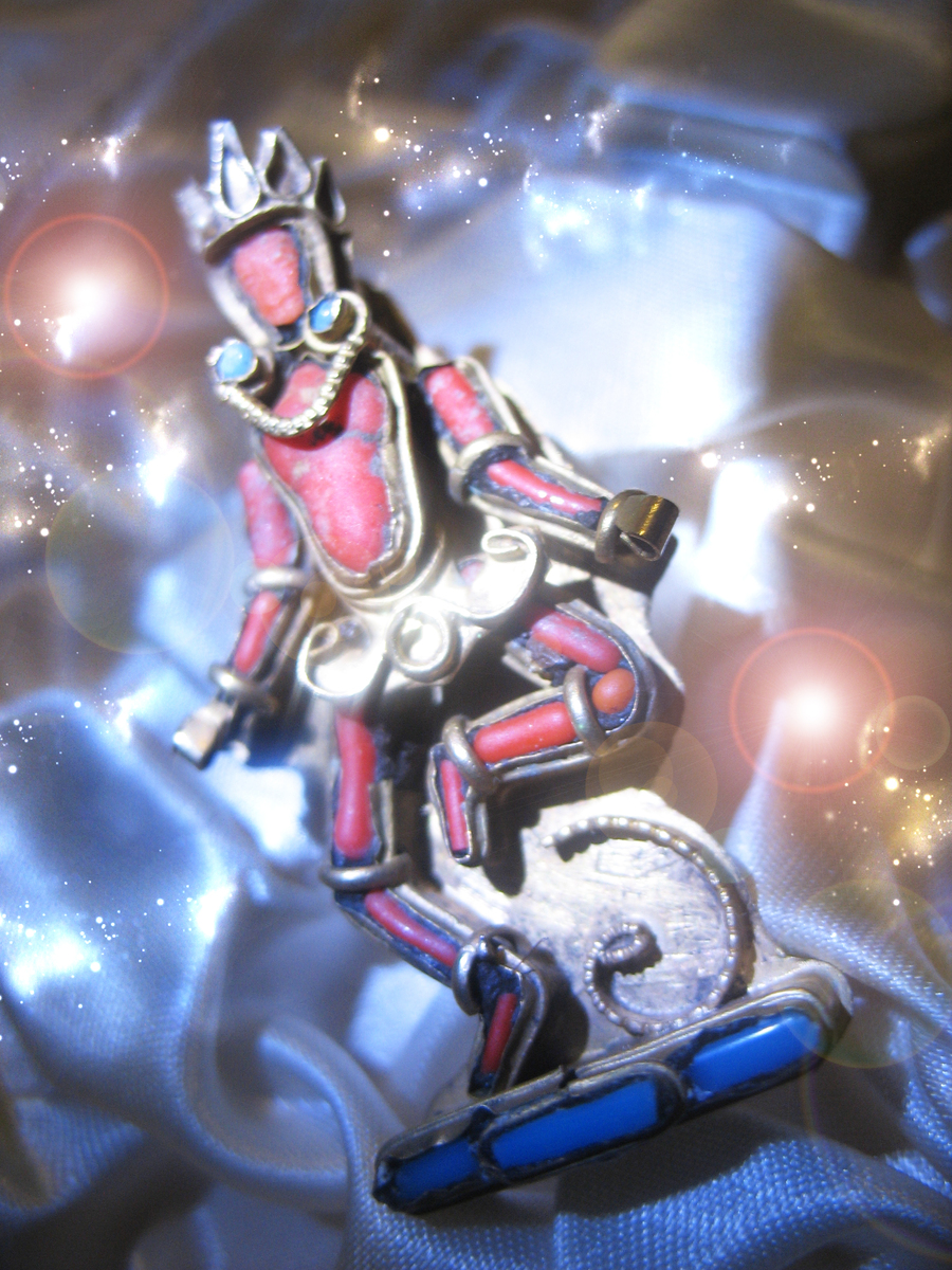 About the Pin : 1 1/2" x 1 1/2" Sterling Coral and Turquoise Dancing God Motif Ornate Pin from the 1800's