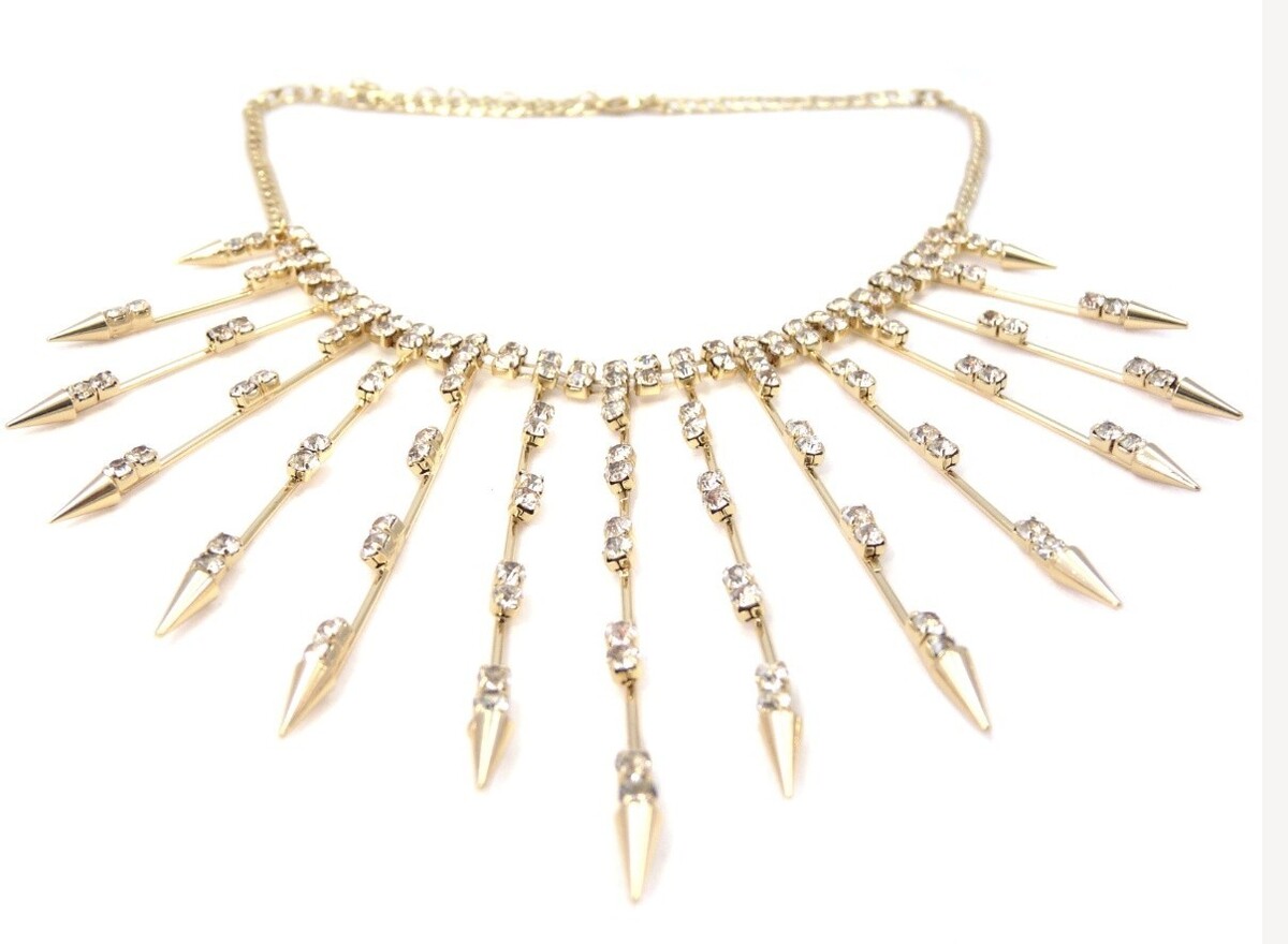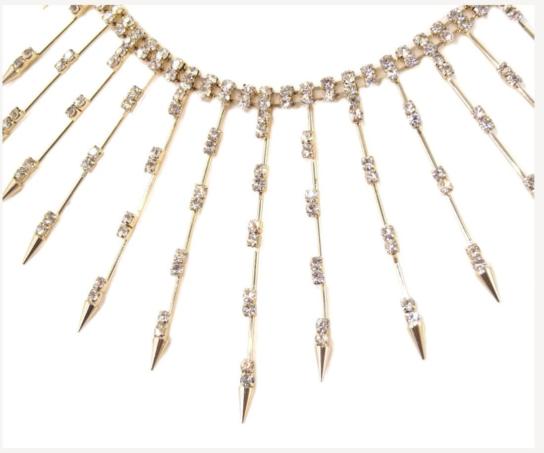 Statement Gold Fringe Necklace Rhinestone Bib Spiked Dangle Collar and earrings