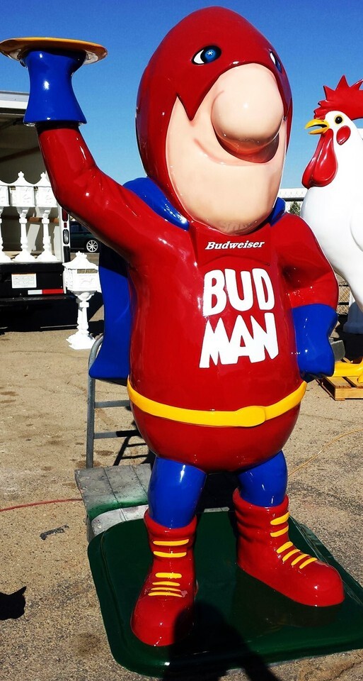 Bud Man Fiberglass Statue 77" tall by 44" wide with a 35" square base