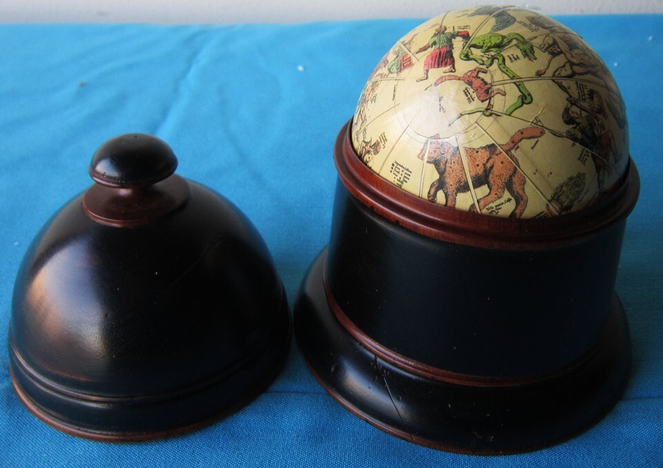 Earth The Heavens 3.5" Globe stored in a carved wood case that measures 4.5" in diameter by 6" tall.