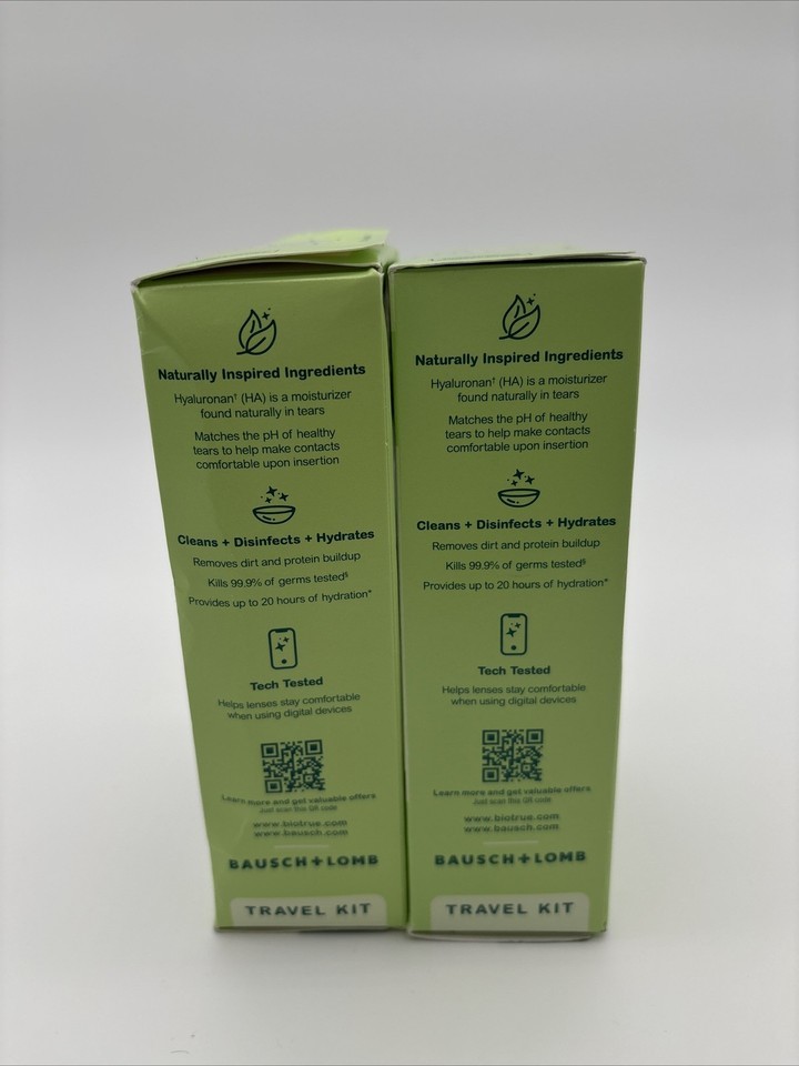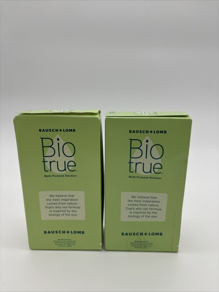 2 Bausch + Lomb Bio True Multi-Purpose Solution 2 oz each Travel Size . Exp : 2026-08-01, dates may vary. Packages may contain shelf ware, retail stickers or cosmetic imperfections Boxes are damaged