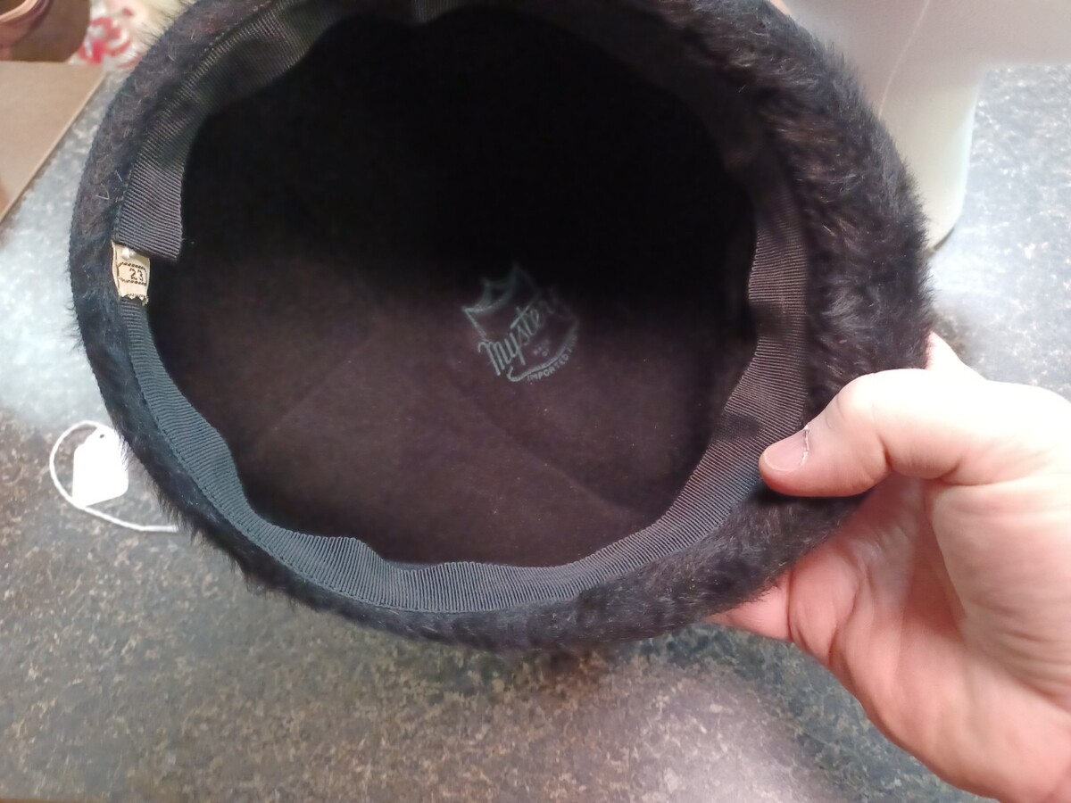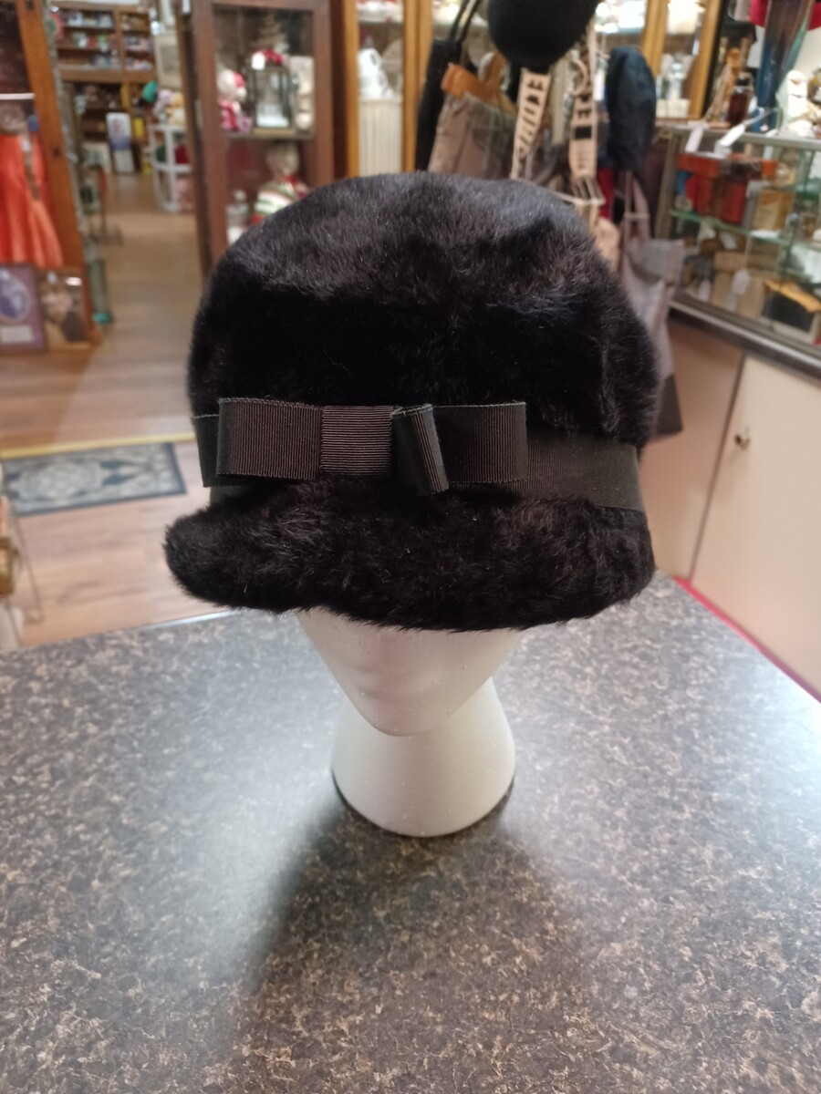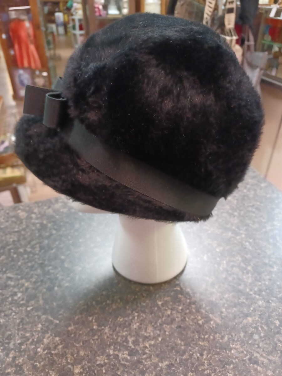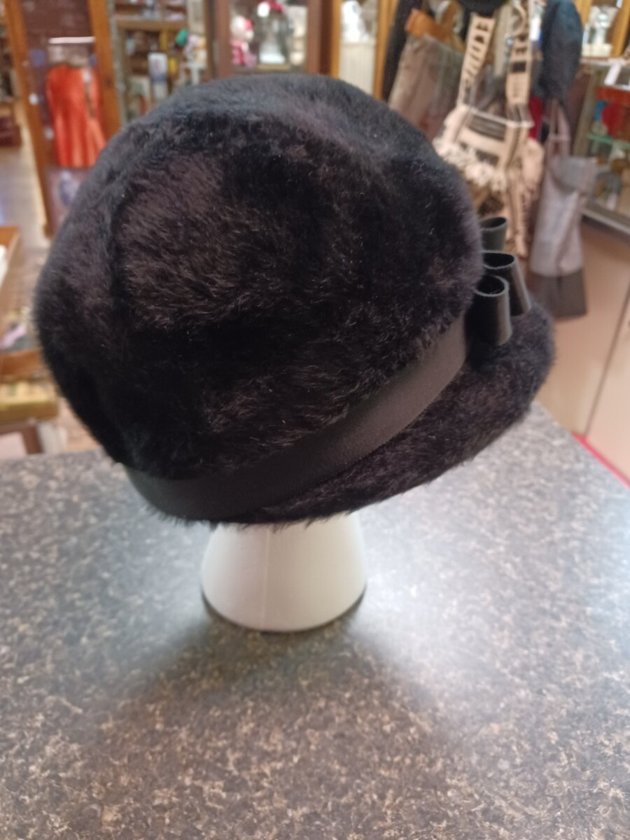 Vintage 1950s Black Fur Cloche Hat Mystere Ribbon Bow Women's Imported