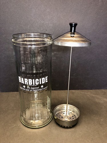 Vintage Barbicide Barbers Disinfectant Glass Jar w/ Metal Lid and Insert Salon.