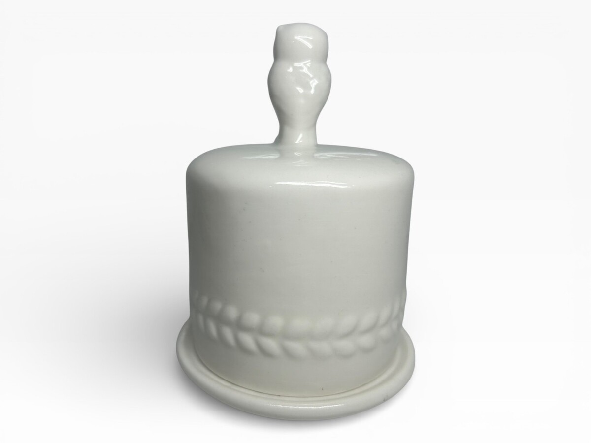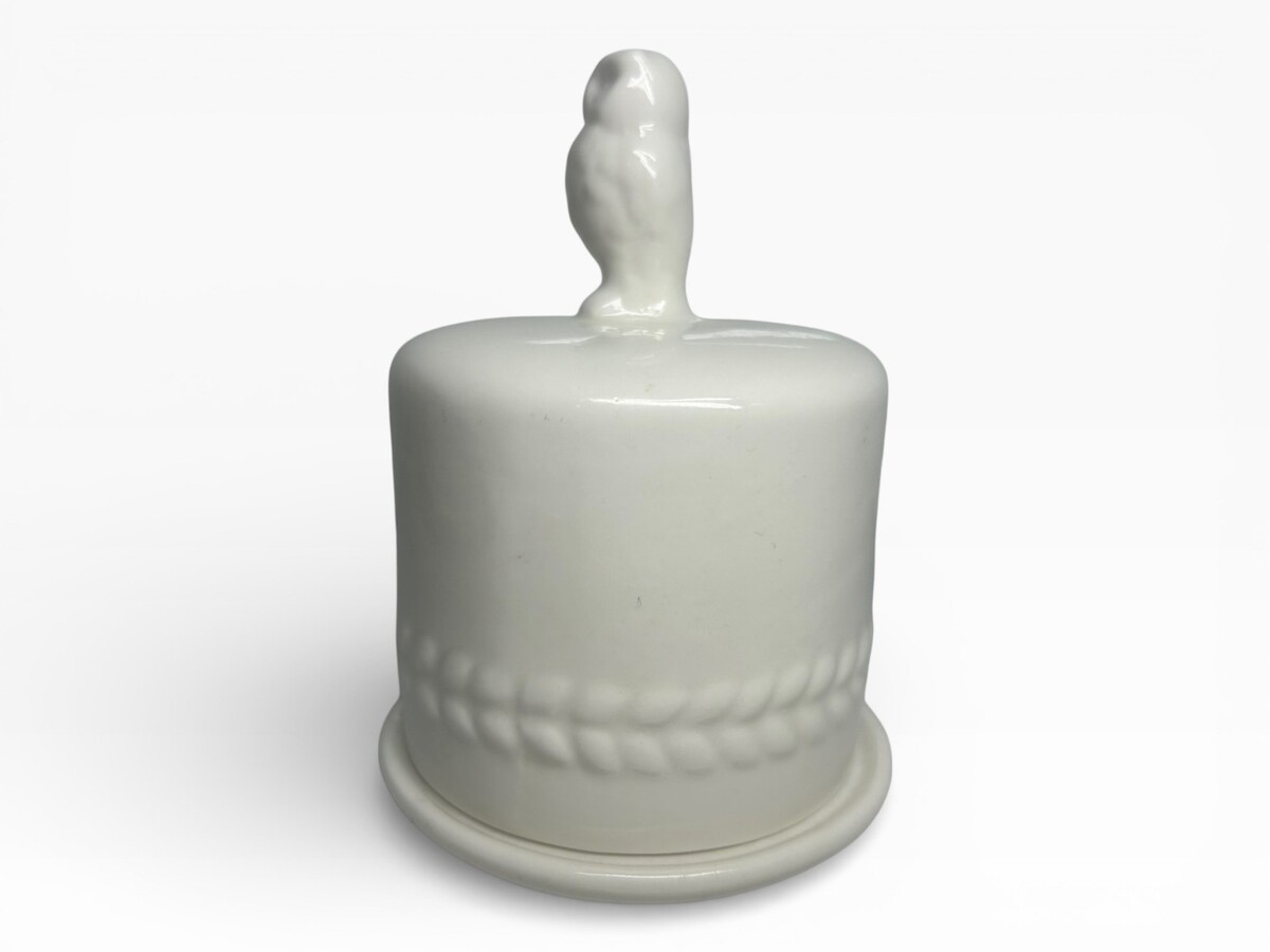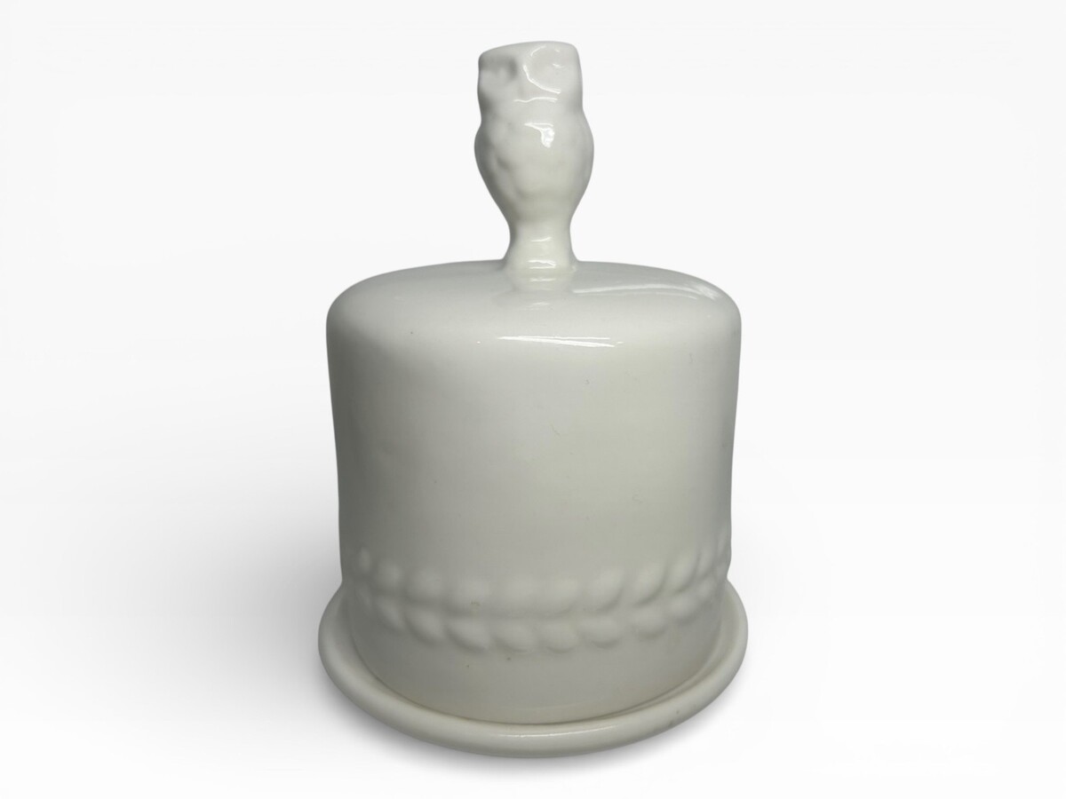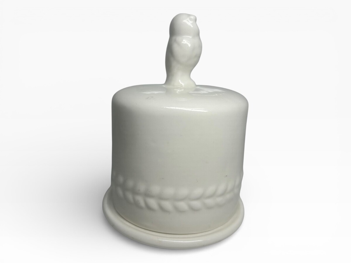 Elegant white ceramic owl butter bell with intricate wheat pattern. Perfect for keeping butter fresh in a stylish and charming way. Ideal for kitchen decor and functional use.