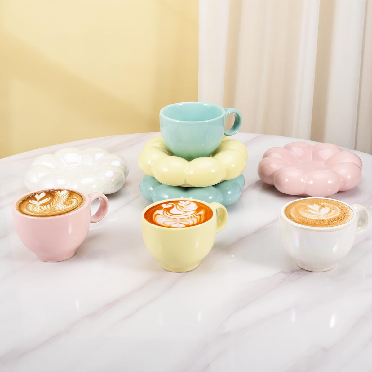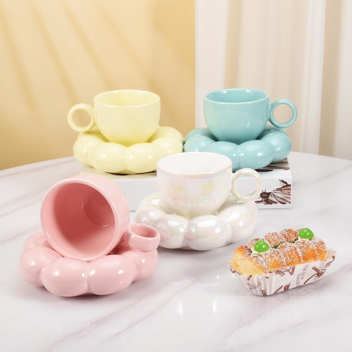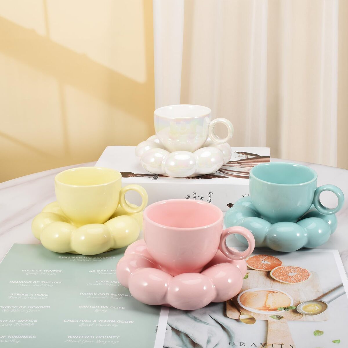 Adorable Coasters: With creative flower-shaped coasters; they are a great decoration for your coffee table and you will enjoy your coffee,Smooth Surface: Ceramic coffee mugs can be easily washed with water; greatly simplifying your life and saving you time; Since the product is an electroplating process; it cannot be placed in the dishwasher or microwave,Unique Design: Handcrafted with irregular shapes; wide cup body and unique handle design; matte finish; showing a clear attitude to life,Multiple Uses: This coffee mug is the perfect way to start your day; This innovative mug holds up to 6.5 ounces and is perfect for drinking coffee; tea or hot chocolate; It's also great for juice; iced coffee; or anything else you like,Ideal Life Choice: The coffee mug is suitable for all kinds of life style; Leisure or busy; spending time with family during Christmas; birthdays; parties and celebrations; A great choice for friends; classmates; roommates; girlfriends; sisters; mom