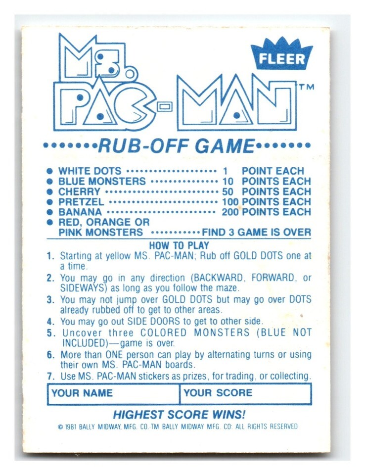 Fleer Ms. Pac-Man 1981 Rub-Off Game Card Vintage 3000