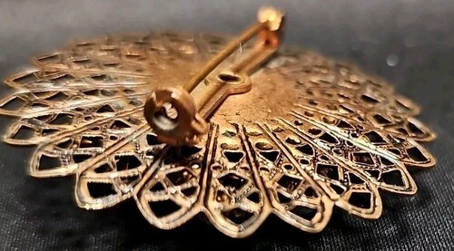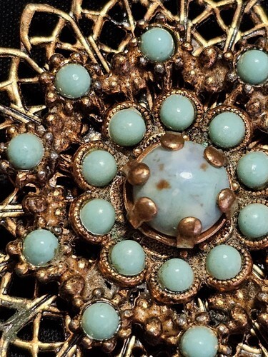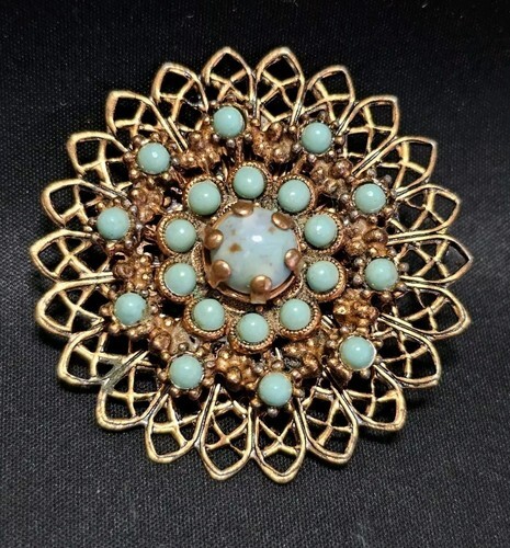 UP FOR SALE: Vintage 1950s Copper Filagree Faux Turquoise Snowflake Floral Estate Brooch Pin