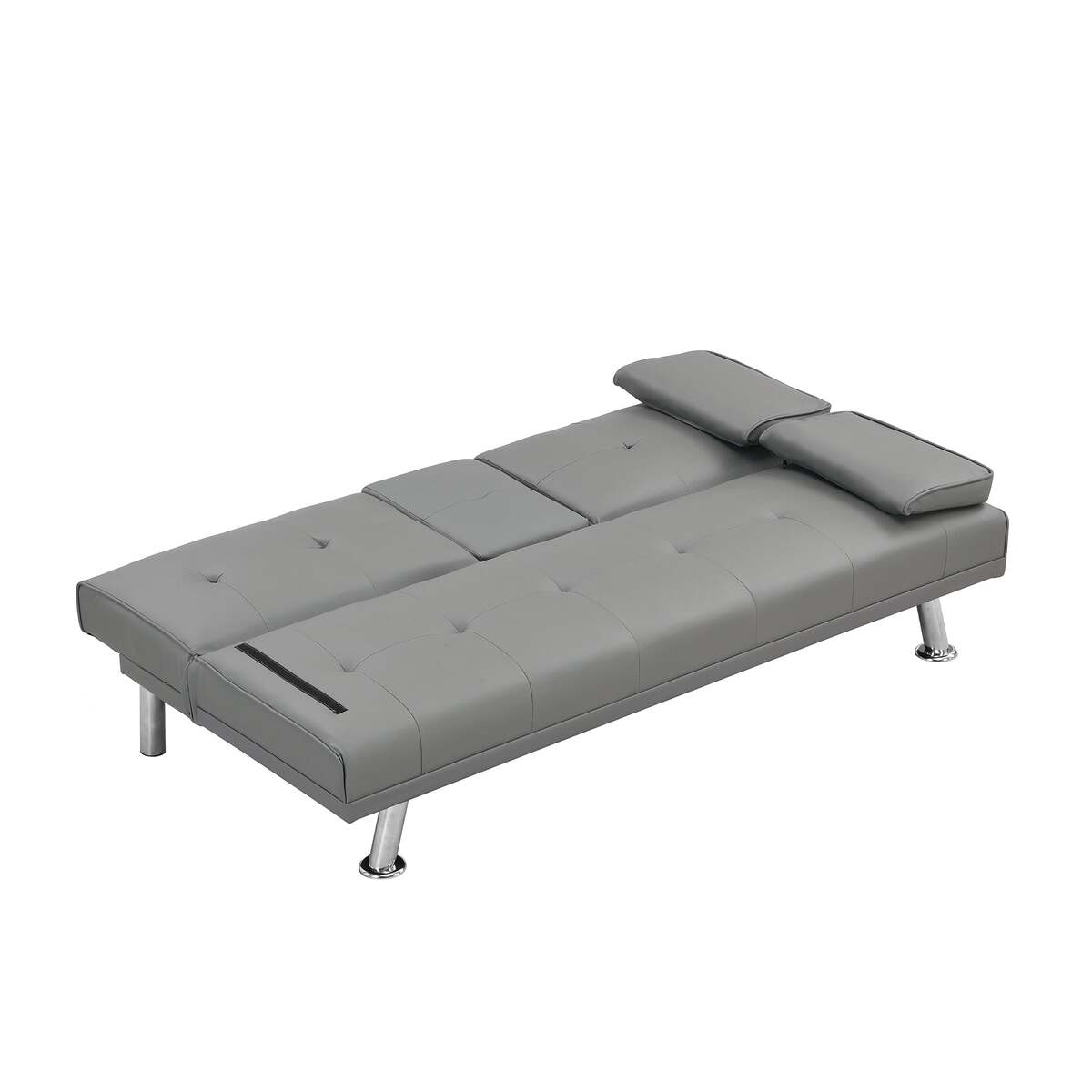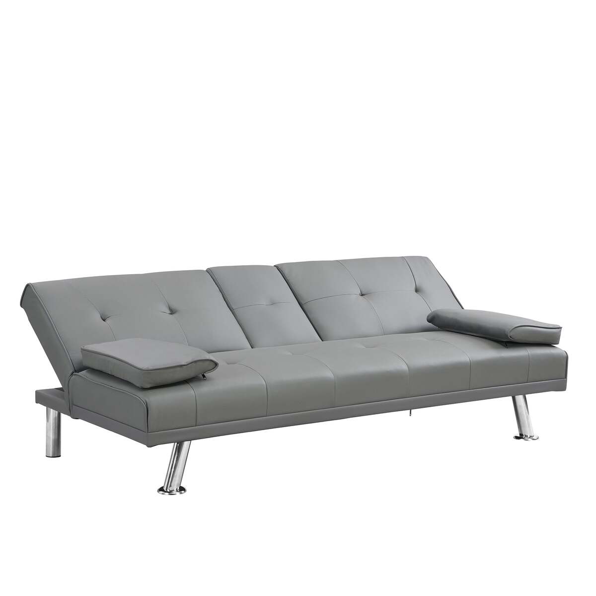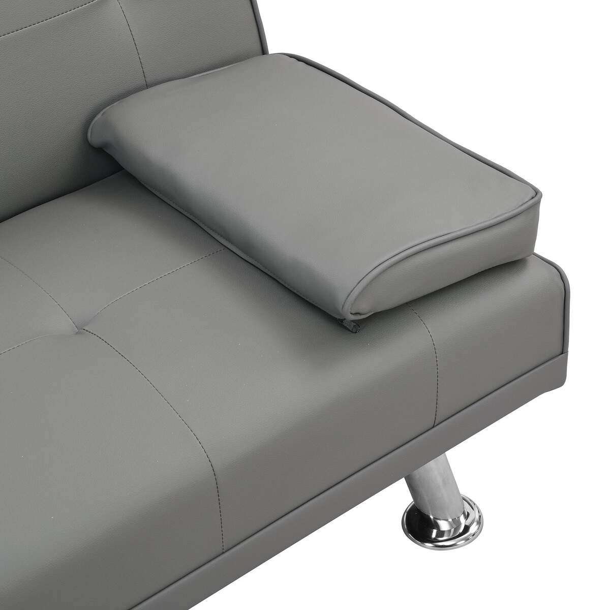 Grey PVC Futon Sofa Bed with Armrests, Cup Holders, Wood Frame, Steel Legs