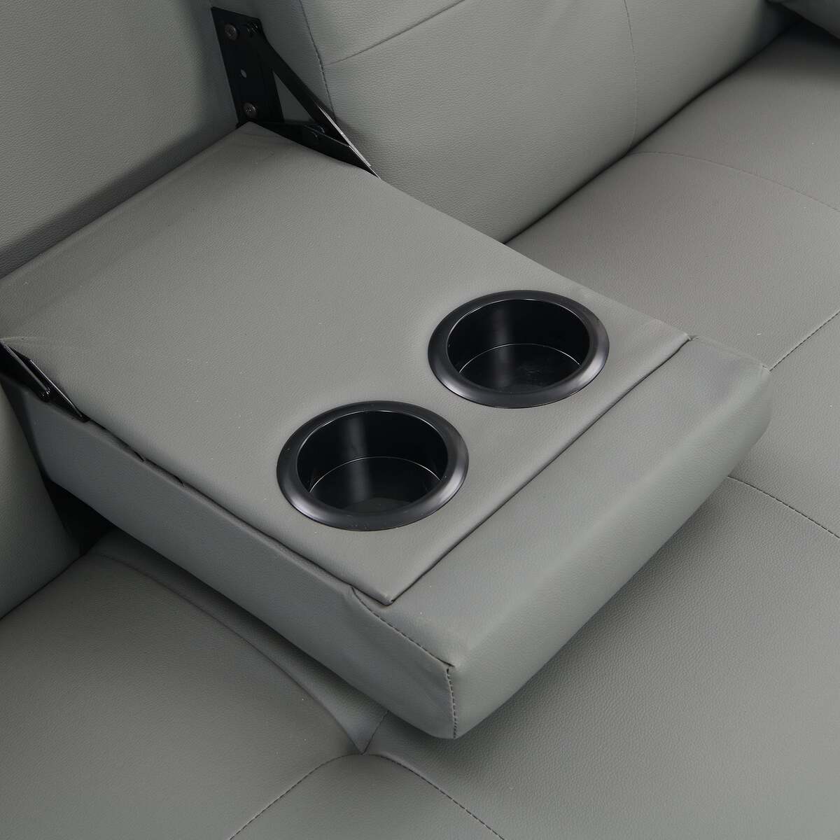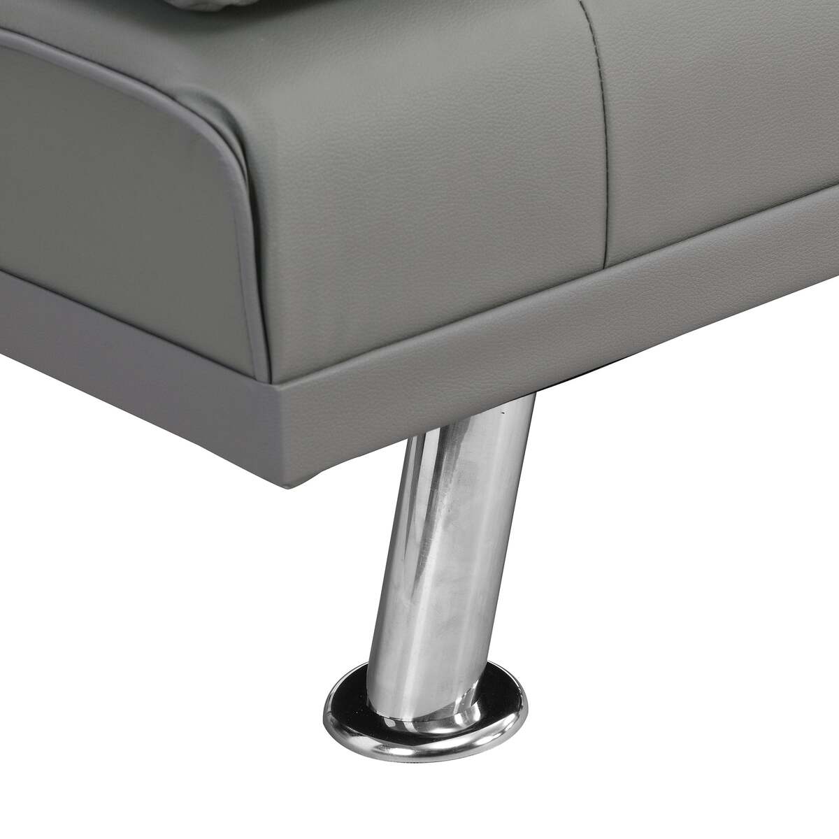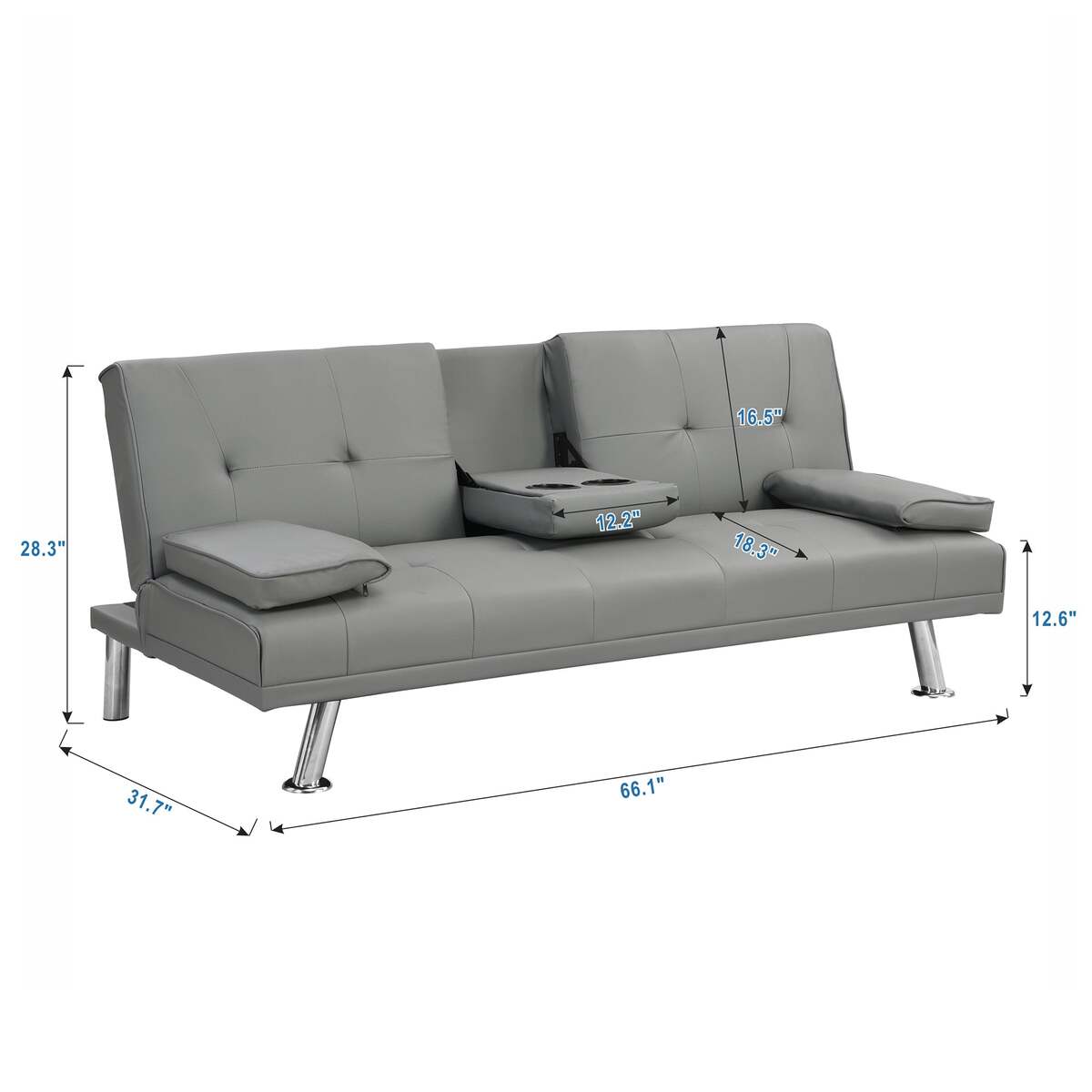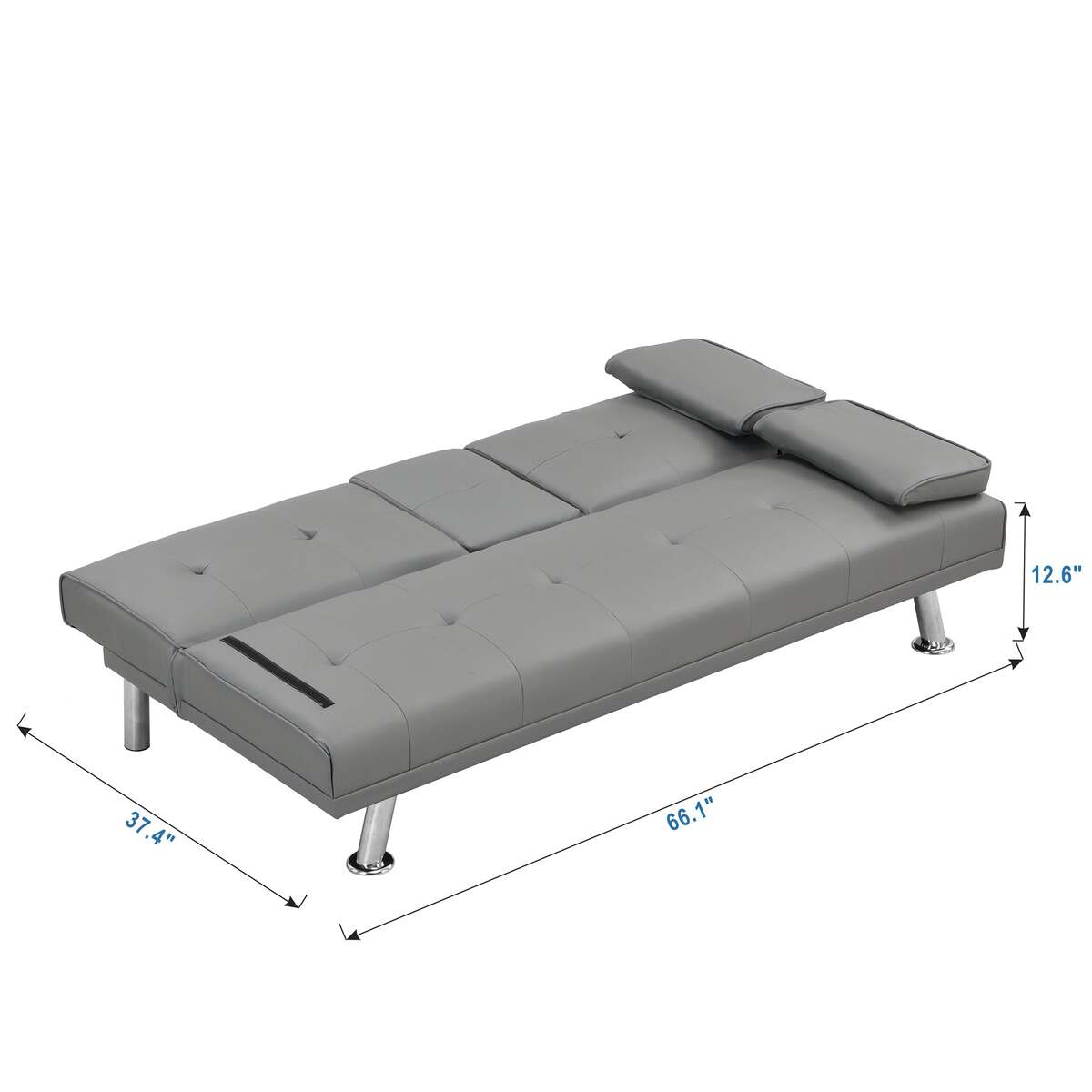 Grey PVC Futon Sofa Bed with Armrests, Cup Holders, Wood Frame, Steel Legs
