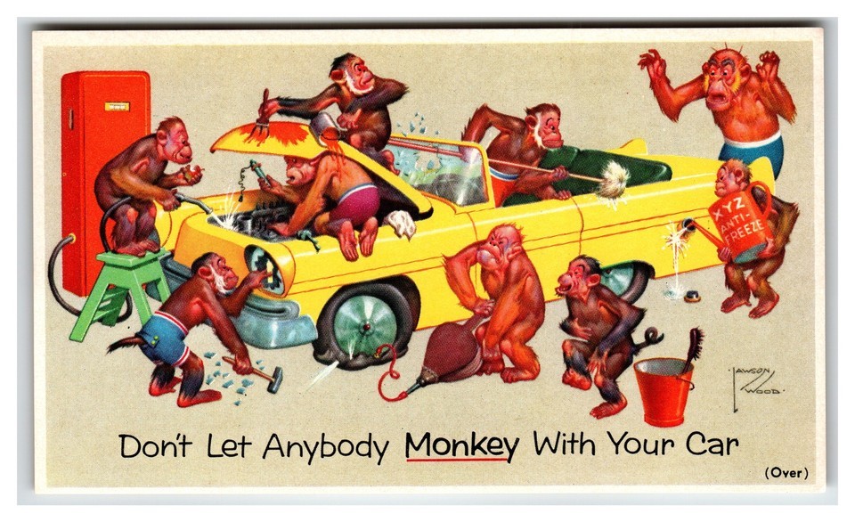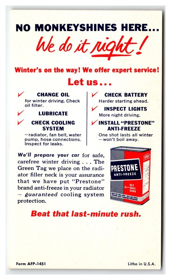Vintage Prestone Anti-Freeze Monkey Car Service Ad Print Postcard Texaco Era Gas