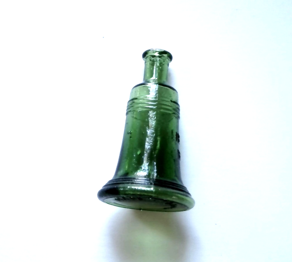 MINI size 3" tall vintage glass bottle circa 1970's. Green color. Excellent condition with some roughness to the bottom rim.