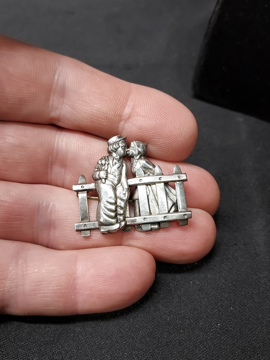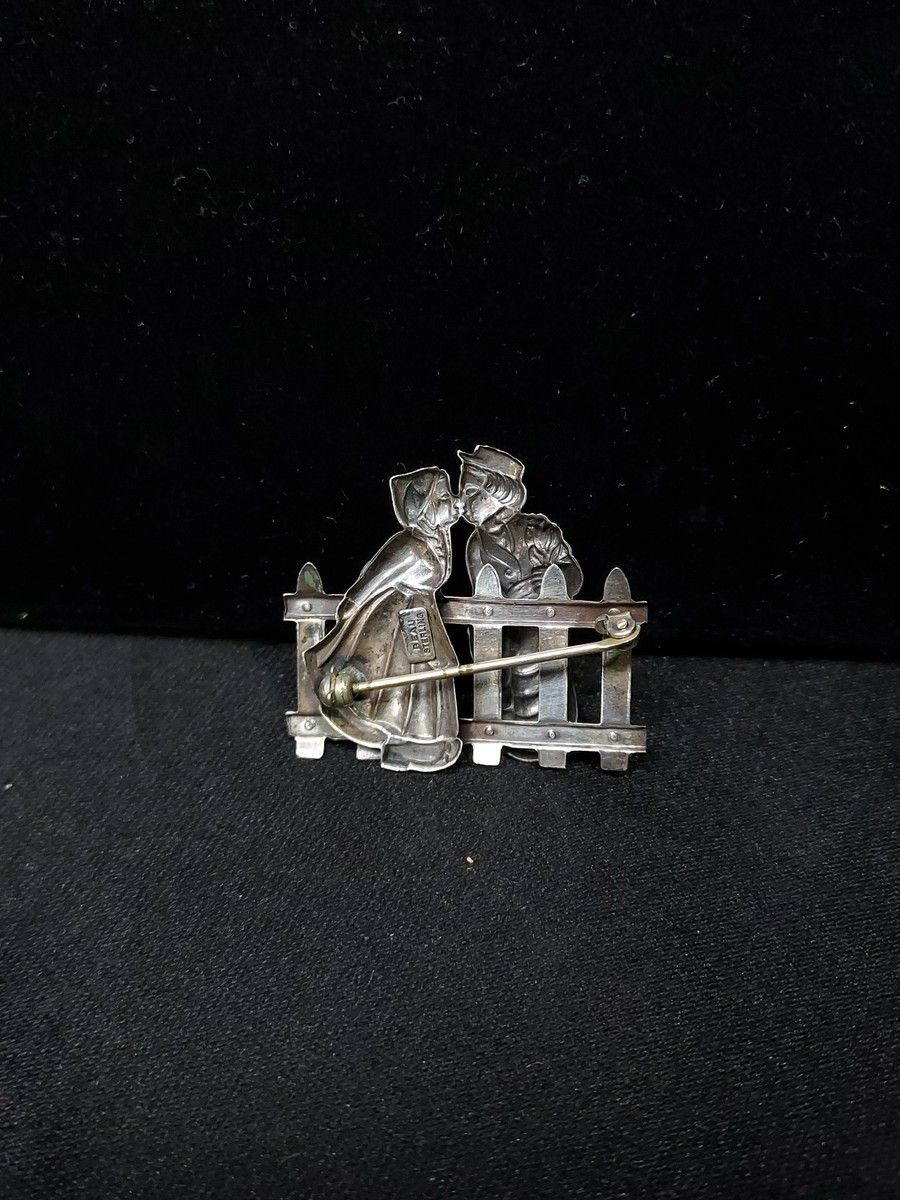 Dutch Couple Kissing On Fence Brooch Pin Signed Beau Sterling Silver 4.76 Grams. Condition is Pre-owned - Good. Shipped with USPS Ground Advantage.
