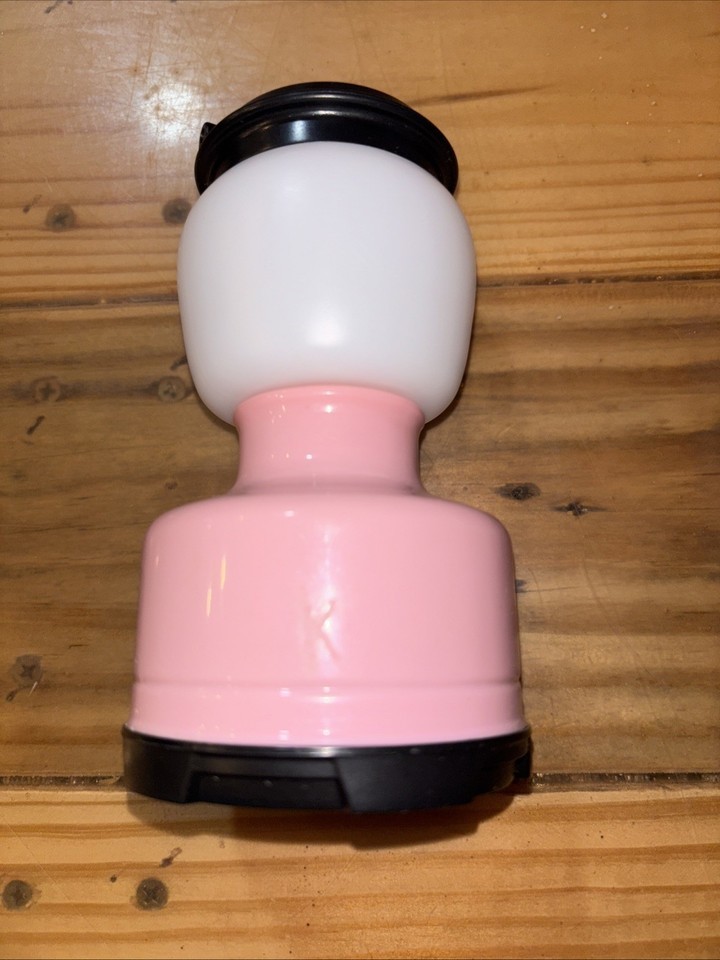 Pink, battery operated (AA) clear light lantern. Push on/off button. 6?x3?. Would be great for camping. It does have a small K carved in on the side that is hard to see unless you?re up close.