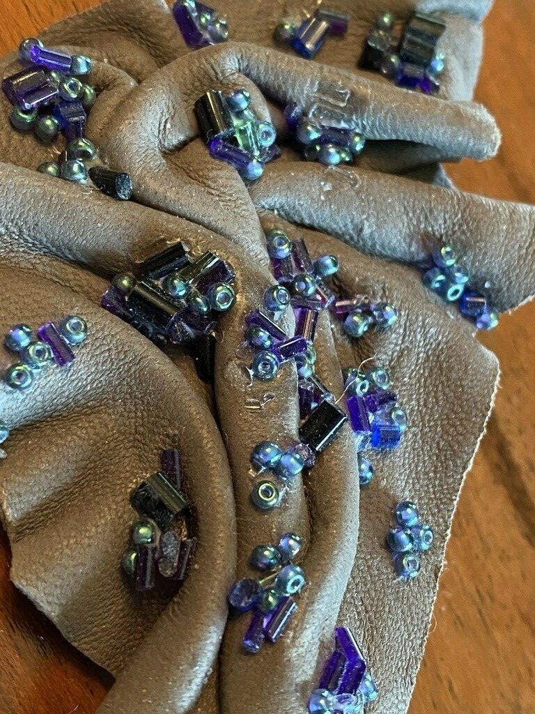 VTg 80s leather Statement Brooch Gray with Blue Beads One of a Kind 5"