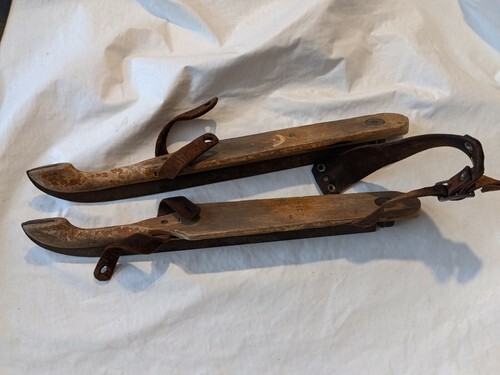 In vendita c'e un usato Armada Primitive Antique Wood Steel Ice Skates Leather Straps del 1800 misura 25.