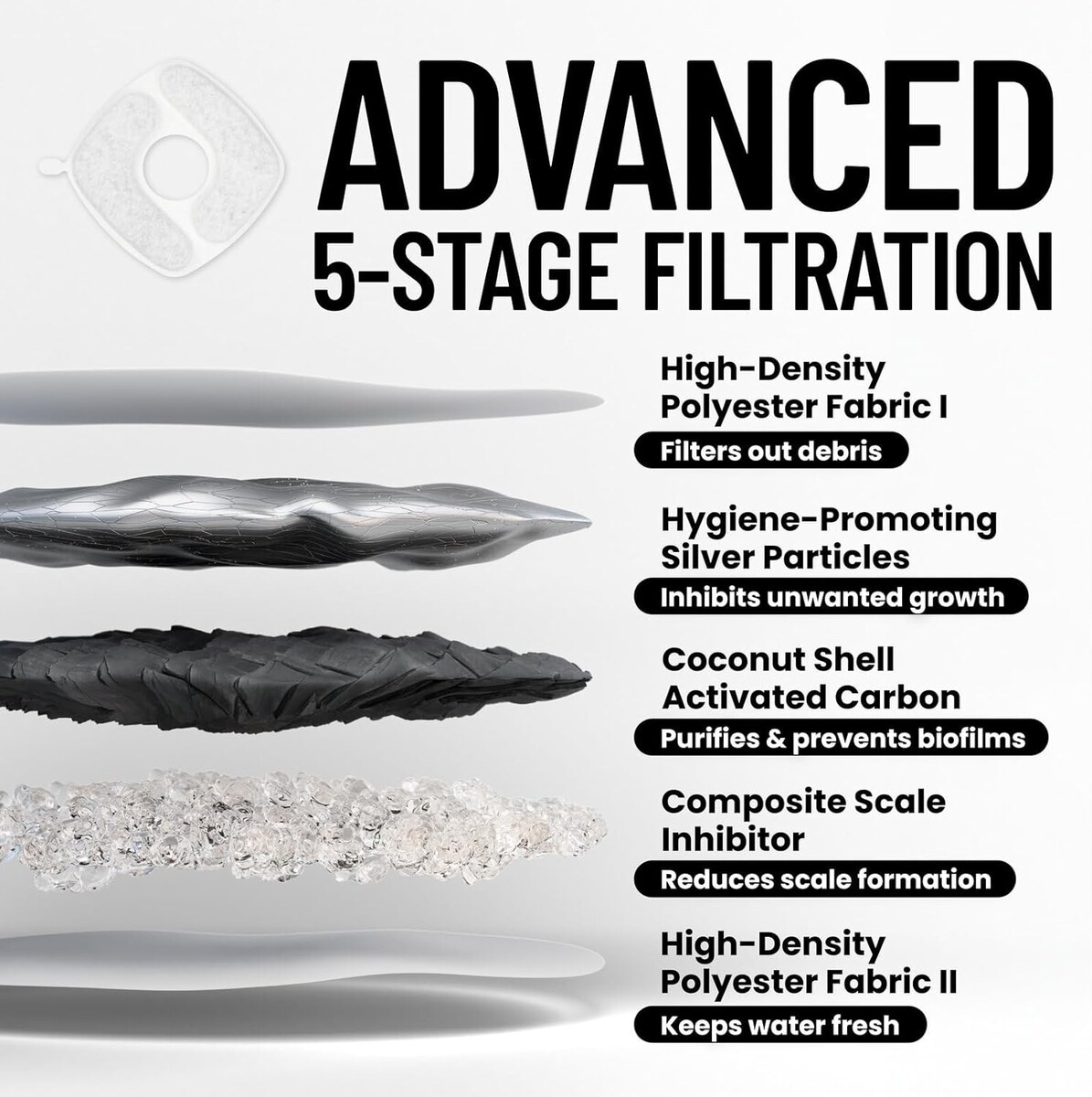 Features: Quiet Operation,LED Light,Detachable Tank,Easy to Clean,Easy to Assemble,Magnetic Induction Power,No Pump Needed,Advanced 5-Stage Filtration,Customizable Water Flow,Includes Silicone Pad,Replaceable Impeller,Cleaning Brush