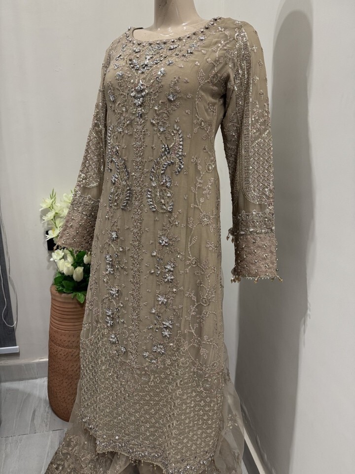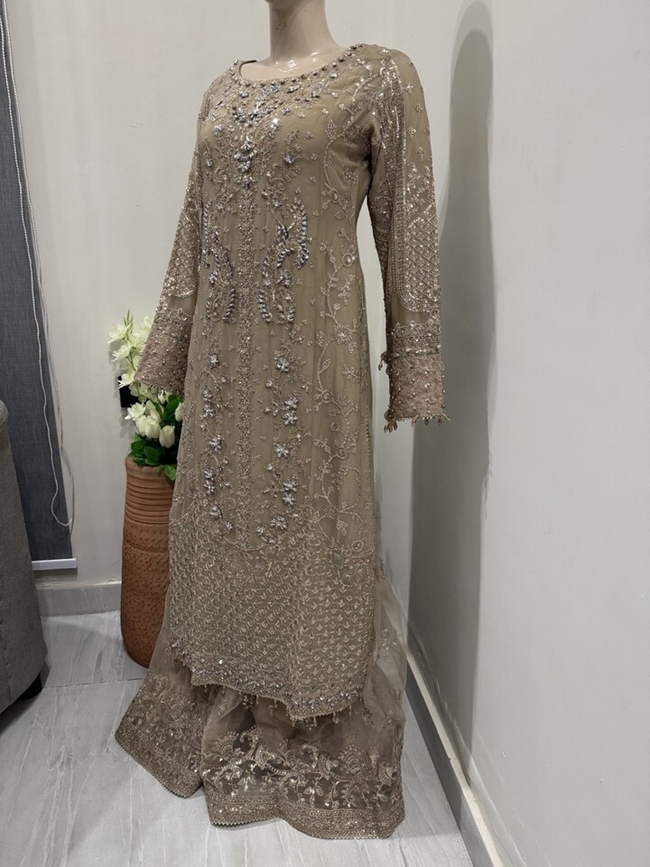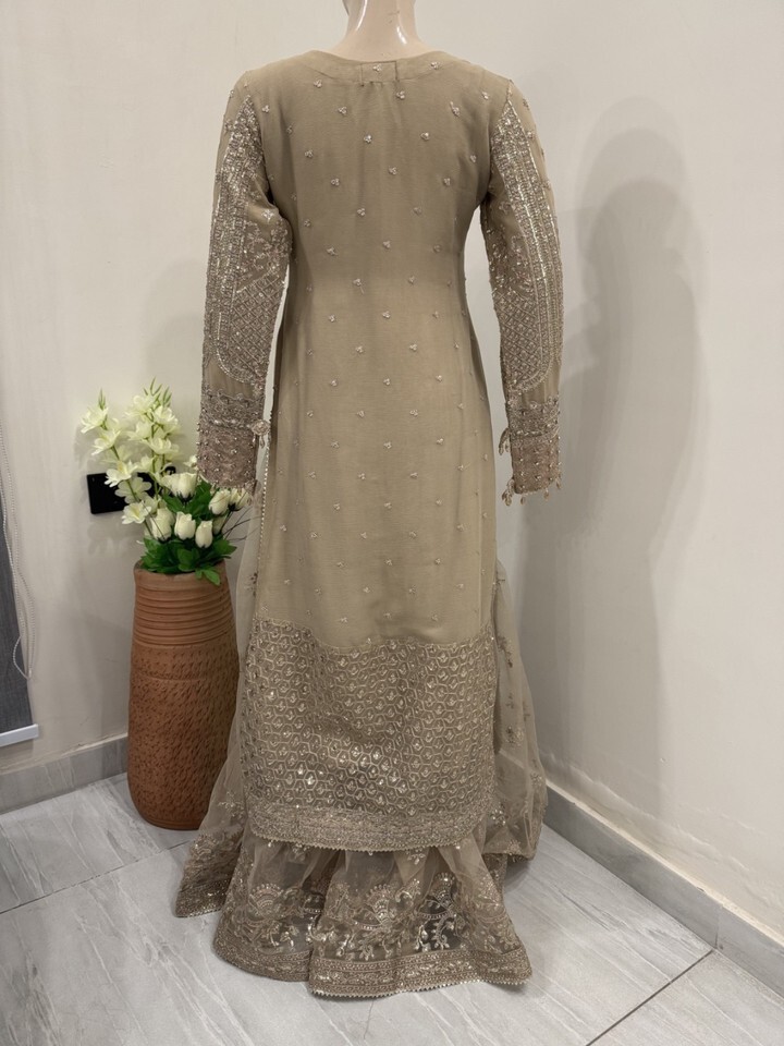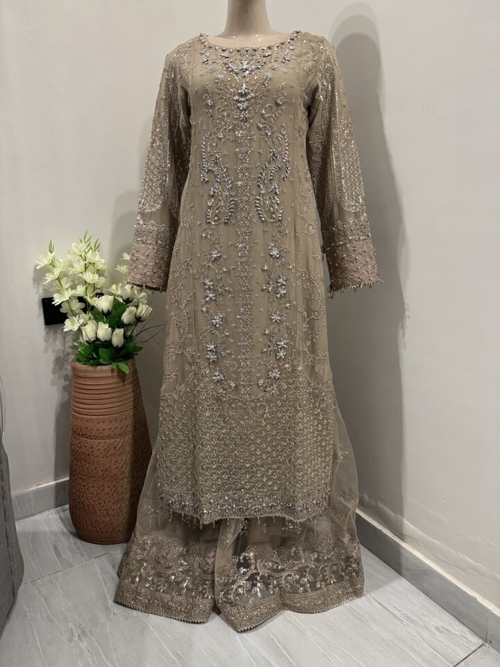 ? Dark Beige net sharara with thread embroidery Sequins work.