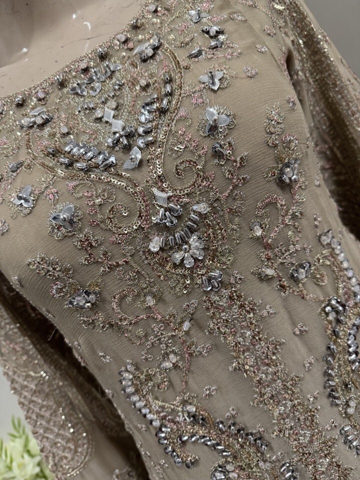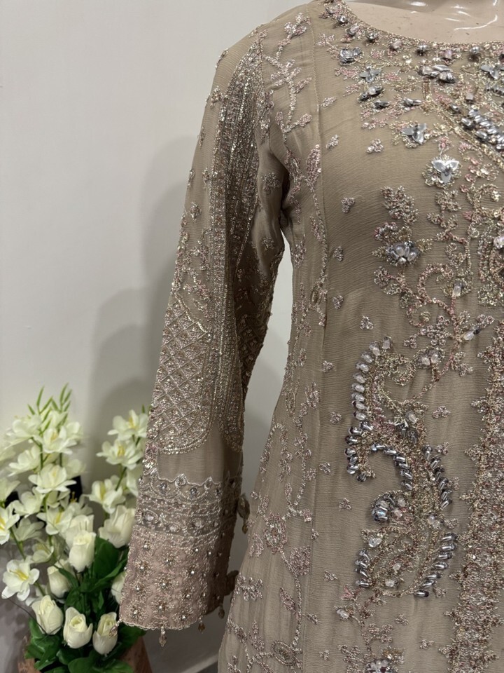 ? Dark Beige Chiffon straight style shirt with thread embroidery Sequins work.