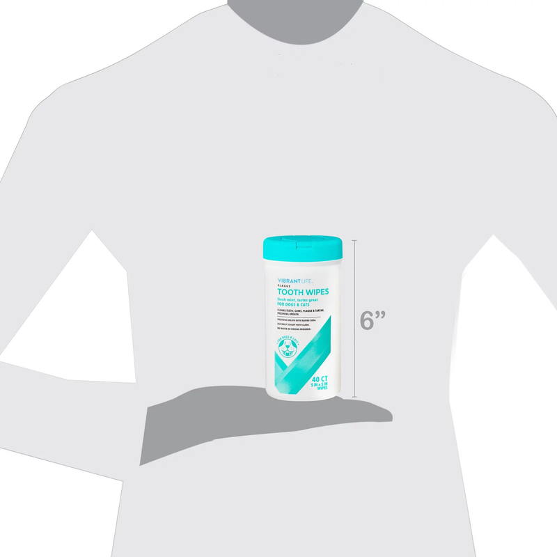 Vibrant Life Tooth Wipes 40 Ct Easy pet care for happy healthy pets Brand Vibrant Life is trusted Activity if cleaning your pets teeth Extra gentle Cleansing your pets teeth Soft wipes White is Color Daily use for dogs and cats Cruelty free Non toxic