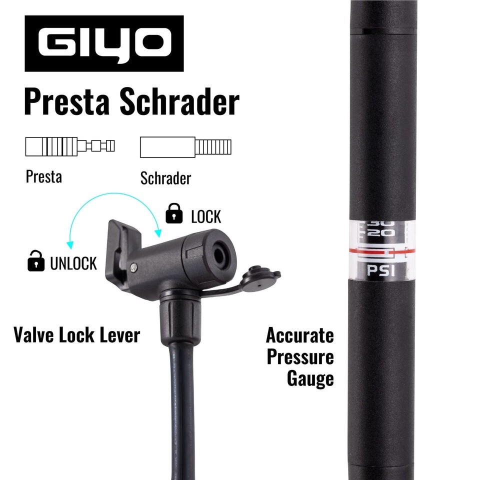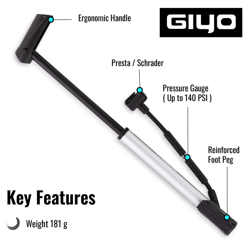 Mini Bike Floor Pump - A powerful but lightweight bike tire pump pressure maintenance tool for all of your bicycles that can be easily carried in a backpack side pocket.,Durable Reliable Bicycle Pump - All aluminum body for weight reduction and durability, will not add significant weight to your bike even if frame mounted,Bike Floor Pump With Gauge - Floor pumps are your daily pressure maintenance tool and we have included an accurate pressure gauge to make this task as easy for you as possible.,High Pumping Volume - Mini floor pumps need to handle a wide range of pressures and tire types - our GIYO bike tire pumps rapidly deliver a high air volume to handle everything from fat tires to road bikes.,Manufacturer Guaranteed - We are the original manufacturer of these pumps and we offer a direct warranty for your peace of mind on all of our products. If you have any questions about these products, just let us know.