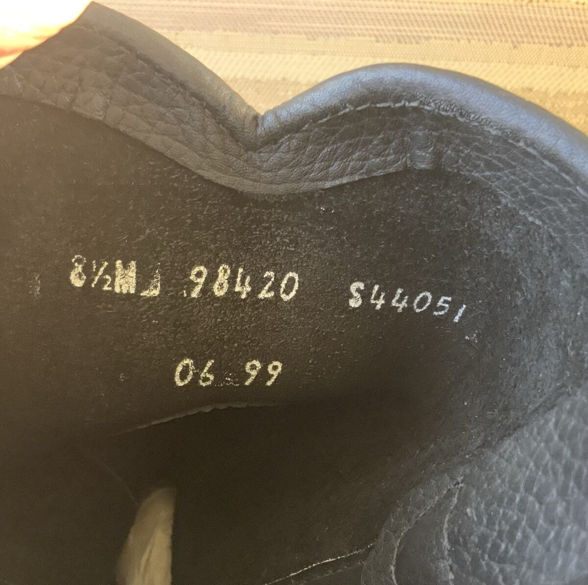 On the left boot shaft just below the embossed logo there is a very slight abrasion noted. Visible in certain angles. Please see photo with blue circle for better description.