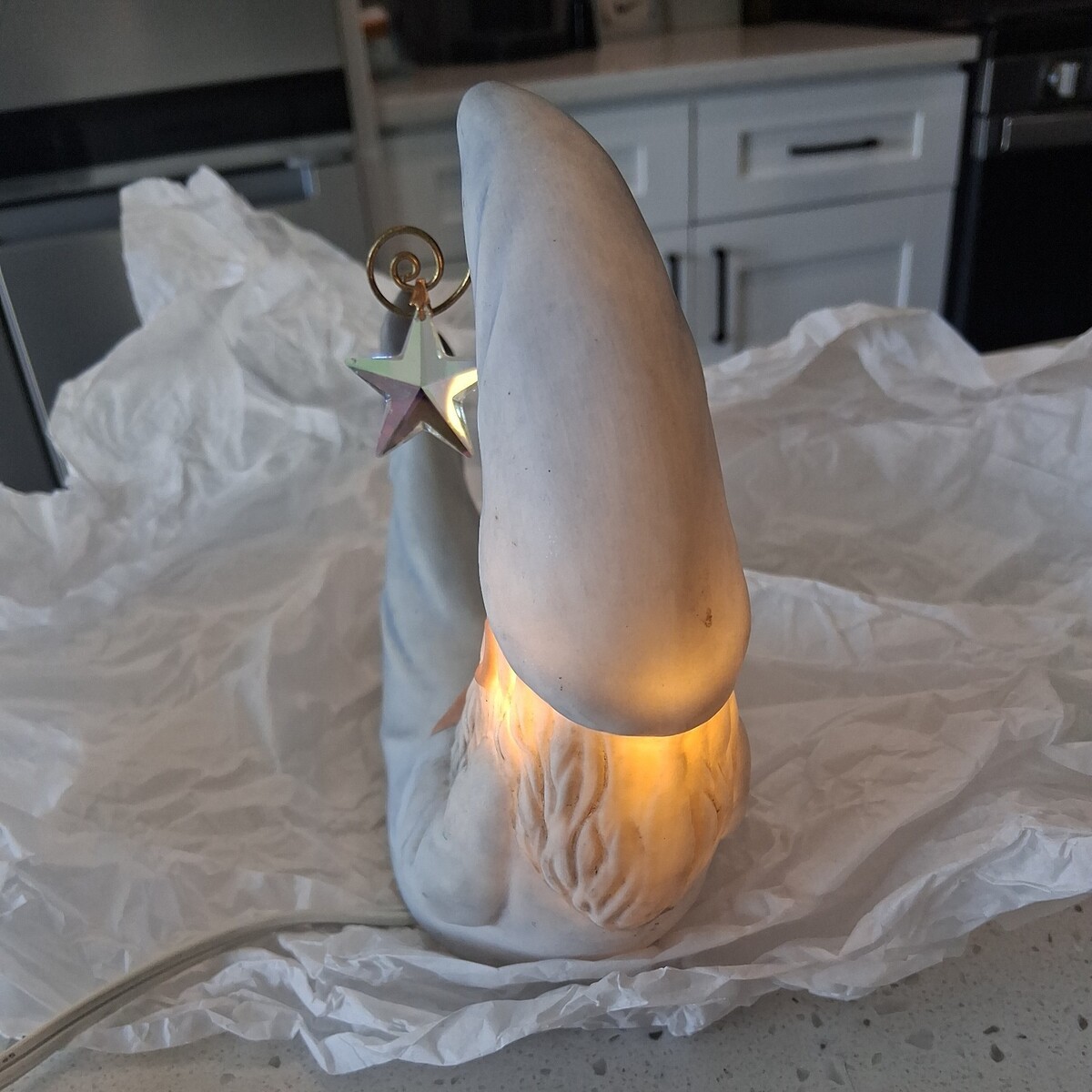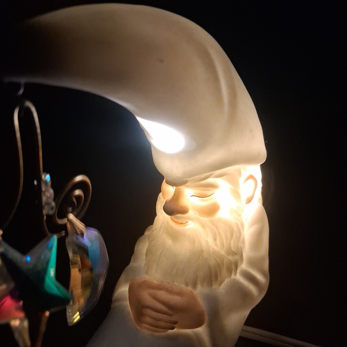 The Vintage Enesco 1982 Faith Wick Merlin in the Moon Night Light Figurine is a charming and nostalgic addition to any bedroom. With its warm white light and French Country style, this corded night light features a porcelain figurine of a man in the moon, perfect for a baby shower or birth and baby occasion. Measuring 6-1/2" in length and 5-3/4" in height, this Enesco figurine brings a touch of fantasy and fairytale to indoor spaces with its compact fluorescent lamp lighting technology. Made in Taiwan in 1982, this unique night light adds a touch of whimsy and magic to any room.