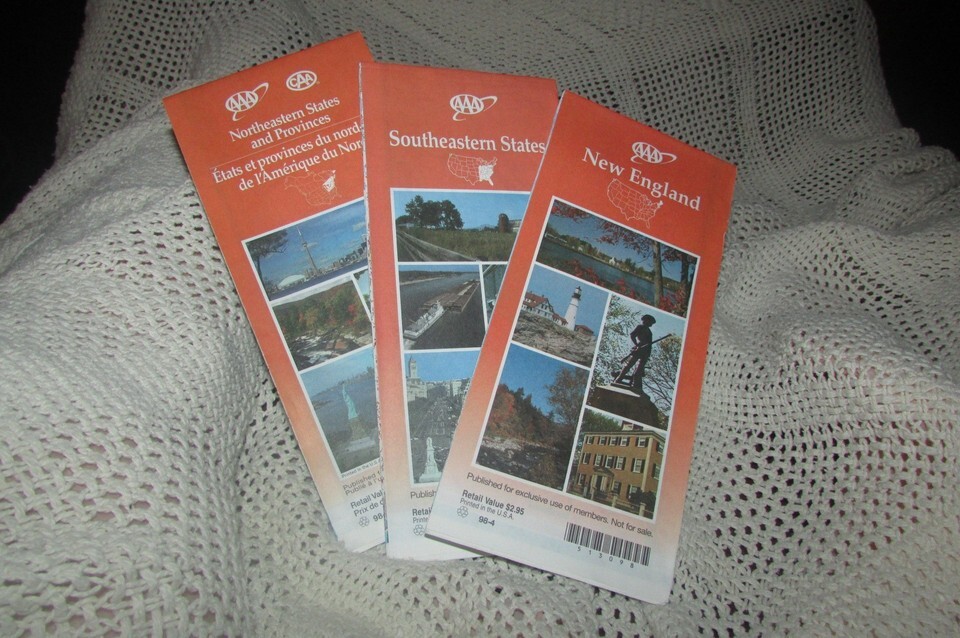 Vintage AAA maps of: the New England region, 1998; Northeastern States and Provinces, 1998; and Southeastern States, 1999; all featuring detailed information on states in the region. These collectible items are a great addition for transportation enthusiasts or anyone interested in historical maps of the United States. These maps are a great way to explore the region and plan trips through the area, making it a valuable piece for collectors of maps and atlases, or that 4 wheel traveler.