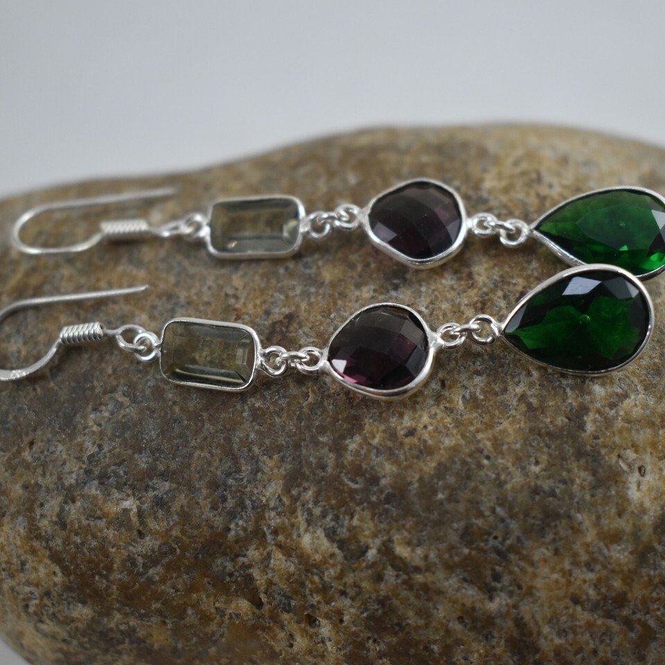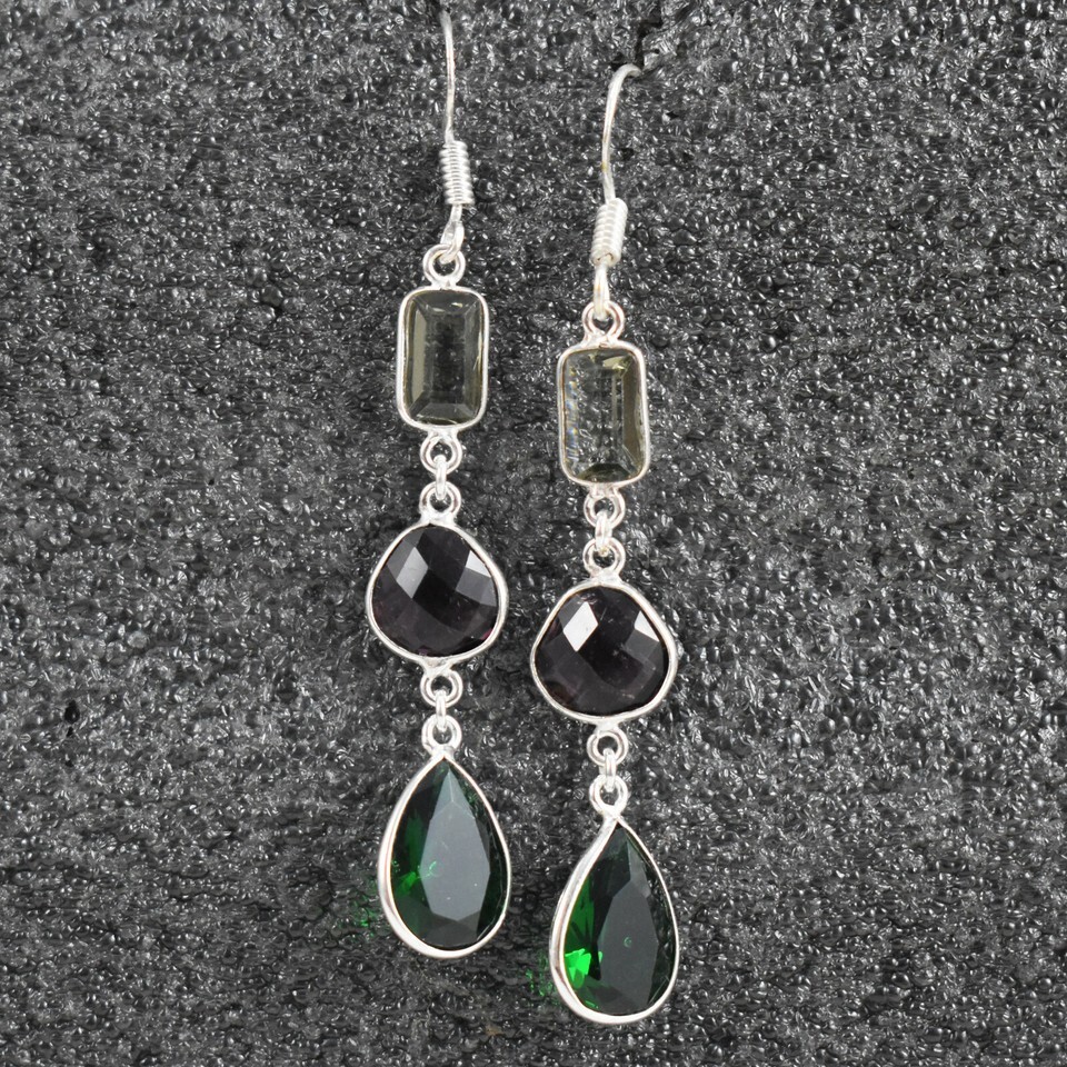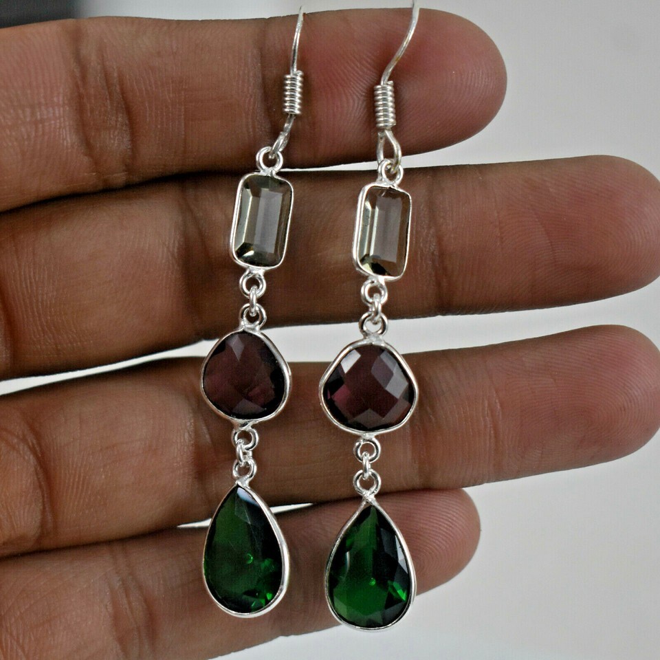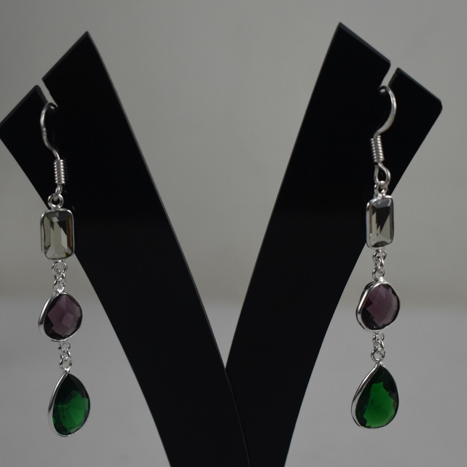 925 Sterling Silver Amethyst & Quartz Gemstone Handmade Earrings HerGift BES1452