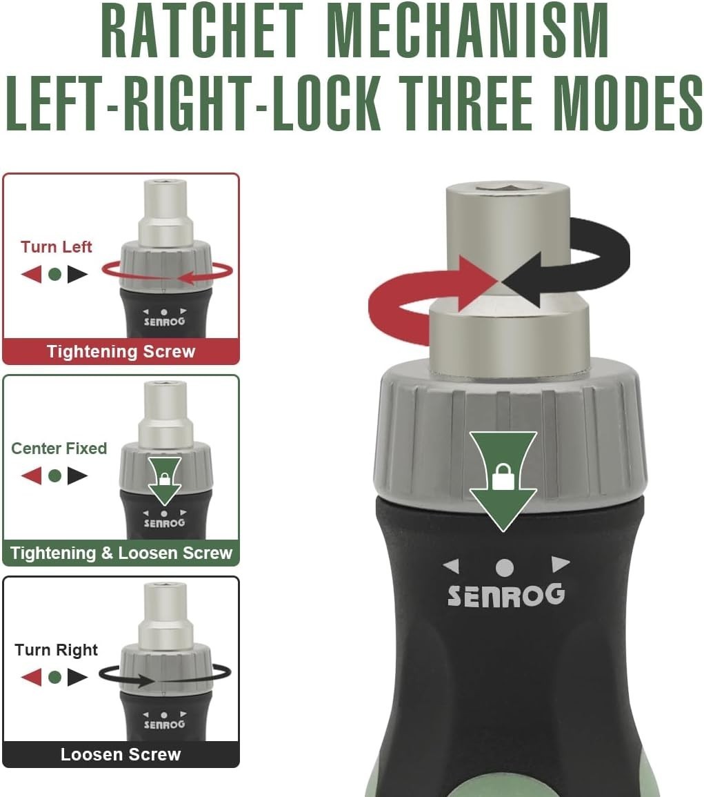 [Three Fast Switching Modes]: Achieve clockwise, counterclockwise ratcheting and locking positions by rotating the adjustment ring of the Senrog Magnetic Ratchet Screwdriver, saving time and energy.