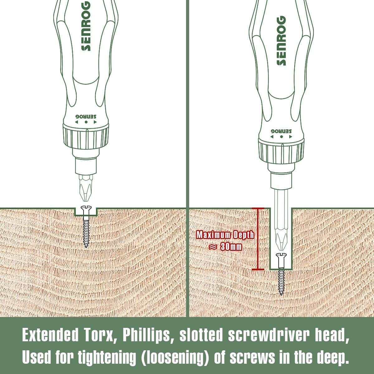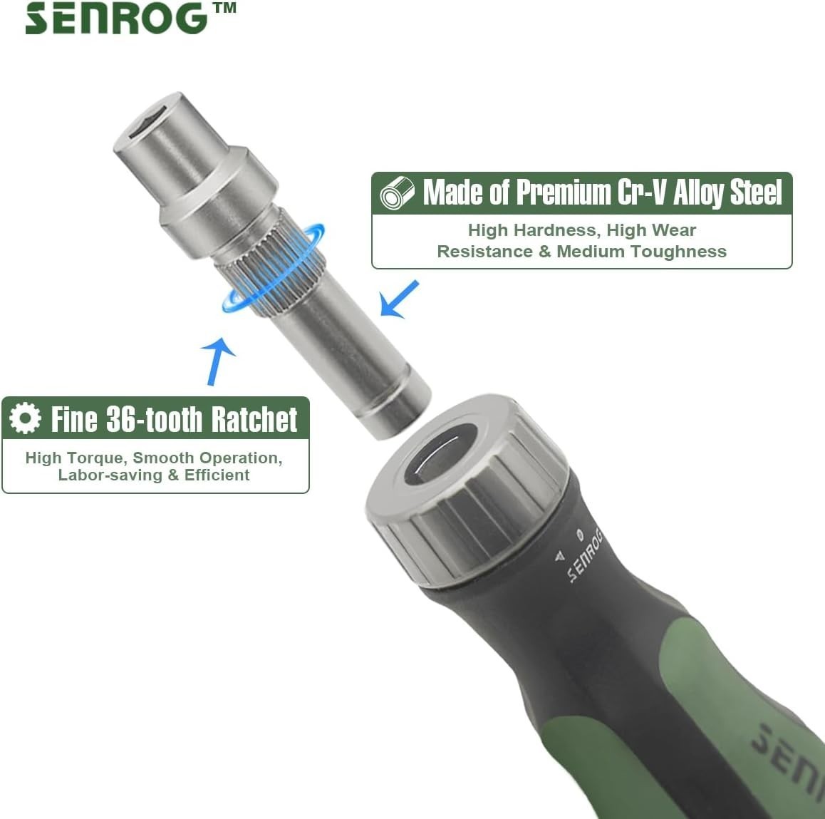 [Ratcheting Mechanism]: Senrog ratcheting screwdriver features an ultra-smooth 36-tooth ratchet, which is more labor-saving and convenient than ordinary screwdrivers for faster and easier driving.