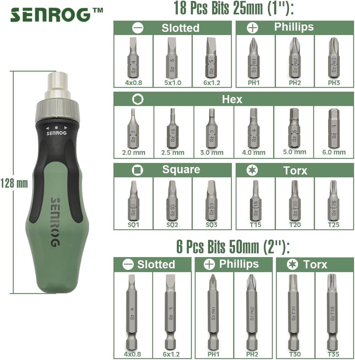[Durable Multi-Bit]: 24 bits are made by high quality S2 alloy steel, a set including 1pc bit holder, 18pcs of 1" bits: Slotted(4x0.8mm,5x1mm,6x1.2mm), Phillips(PH1,PH2,PH3), Hex(2mm,2.5mm,3mm,4mm,5mm,6mm), Square( SQ1,SQ2,SQ3), Torx:(T15,T20,T25), 6pcs of 2" bits: Slotted:(4x0.8mm,6x1.2mm), Phillips(PH1,PH2), Torx(T30,T35) .