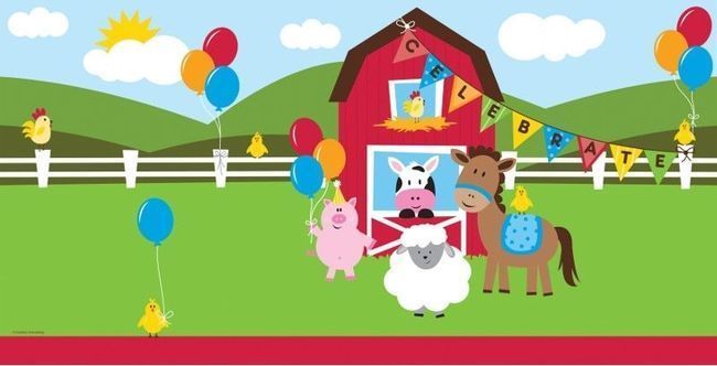 Our Farmhouse Fun Table Cover features happy farm animals along with a red barn. The table cover is designed to fit 6 foot to 8 foot banquet tables. Our Farmhouse Fun Party supplies are sure to add color and excitement to your next party!