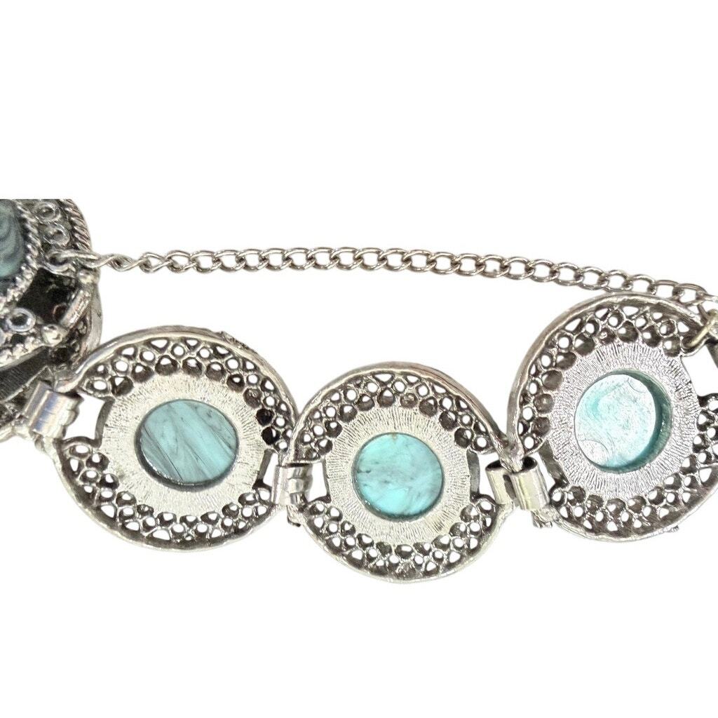VTG 1960s Mod Turquoise Swirl Cabochon Link Bracelet Silver Tone 8.5