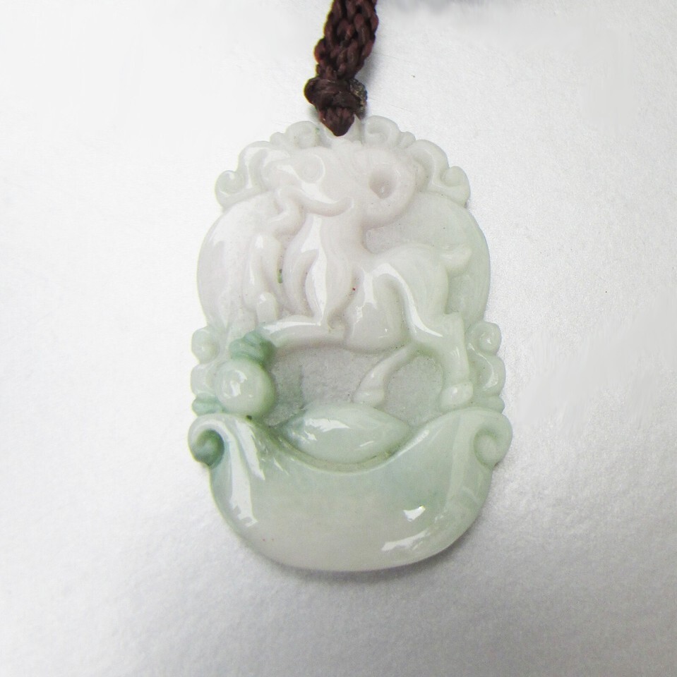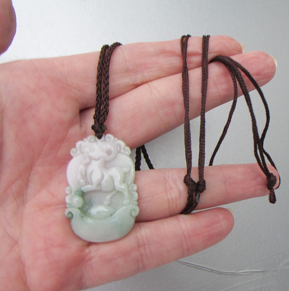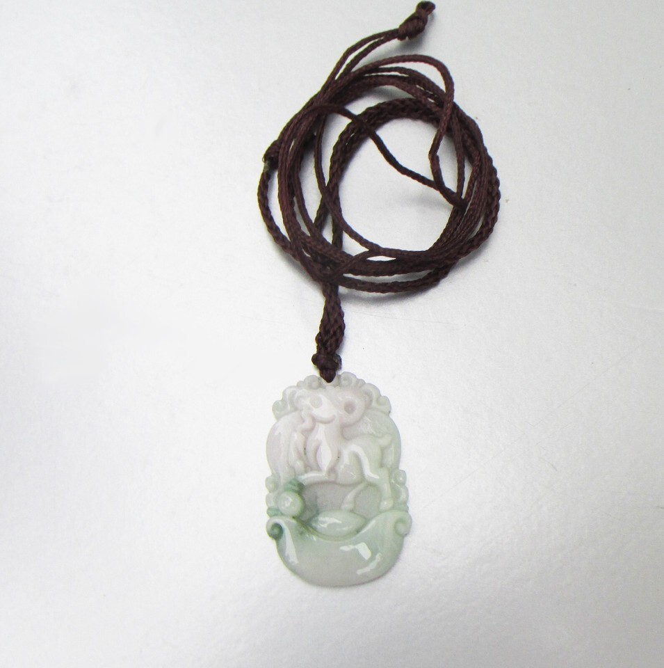 This is a new, never worn vintage carved pale green genuine jade pendant necklace. The 1 3/8" tall pendant has a Chinese horoscope horse standing on either a cloud or a ship. The brown silk braided cord has never been tied so you can tie it to any length you wish from 24" at the longest. It is in mint, like-new condition. It will arrive gift boxed. 3063