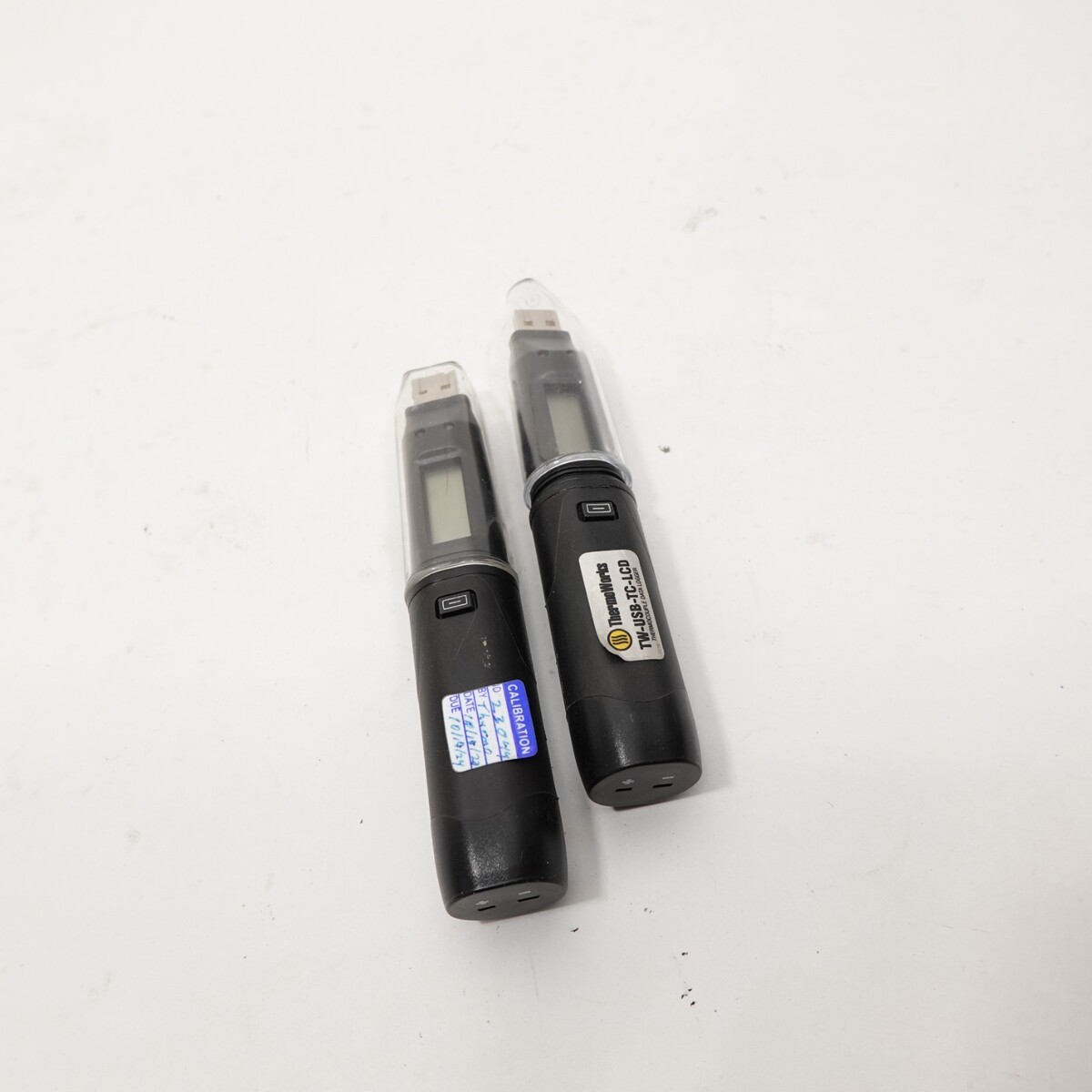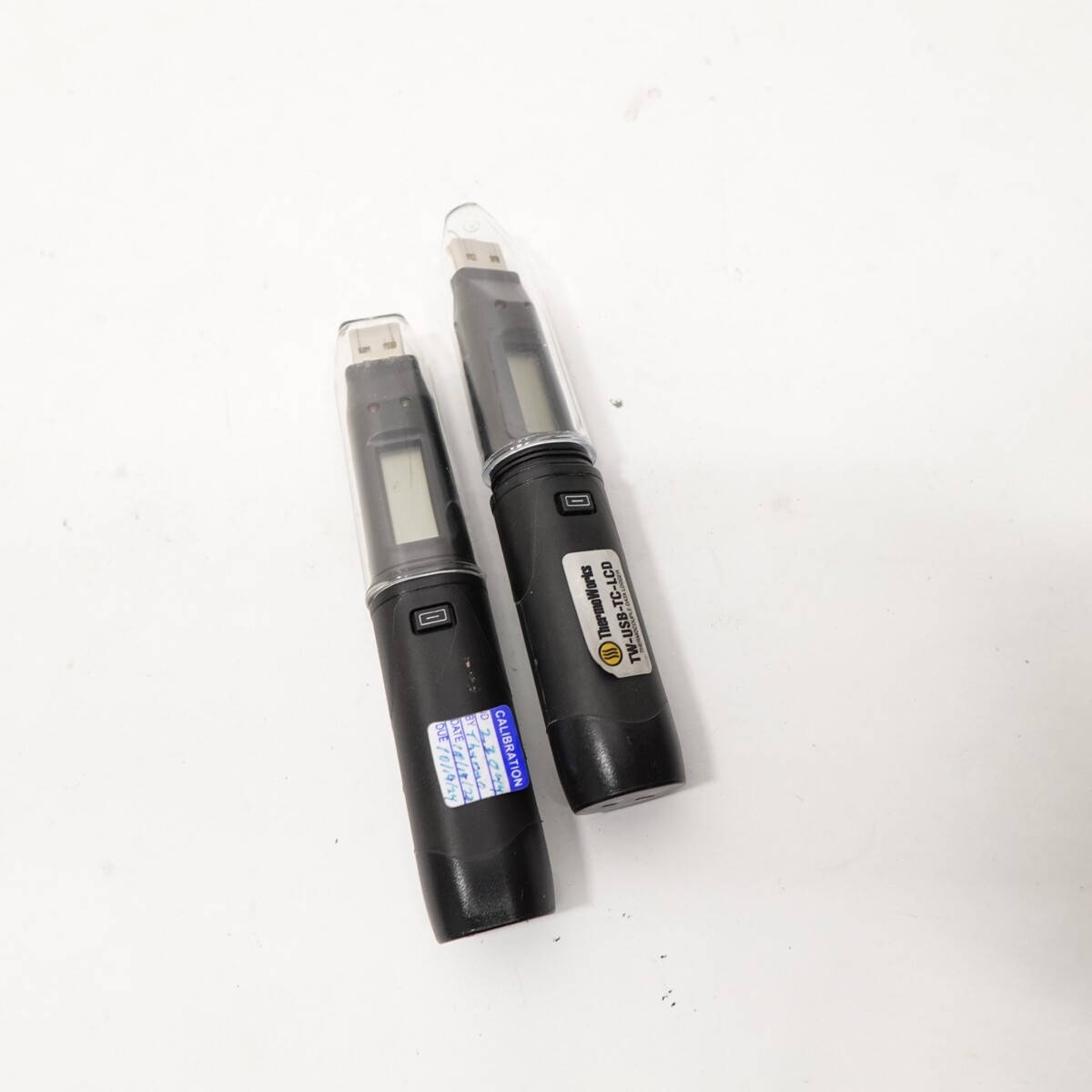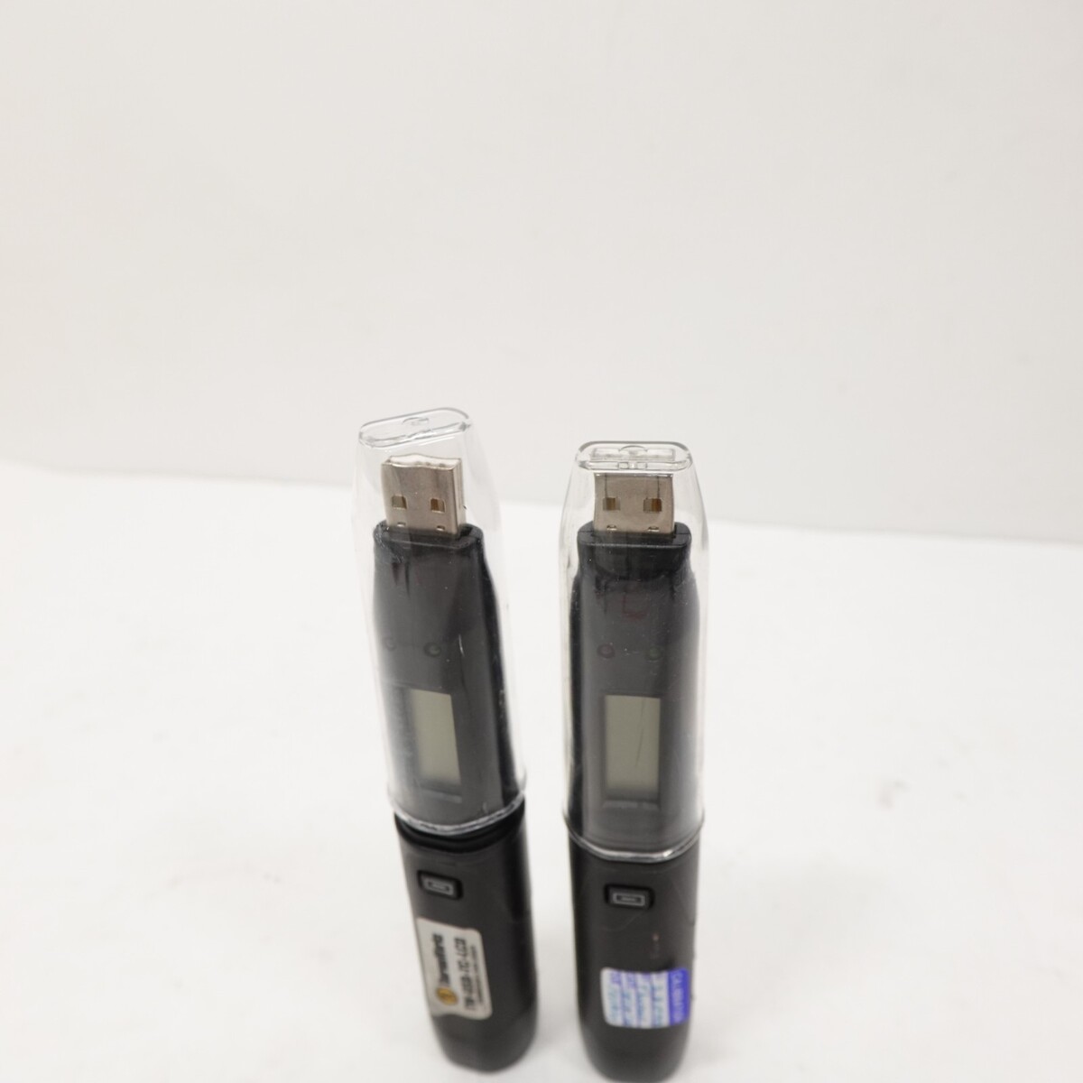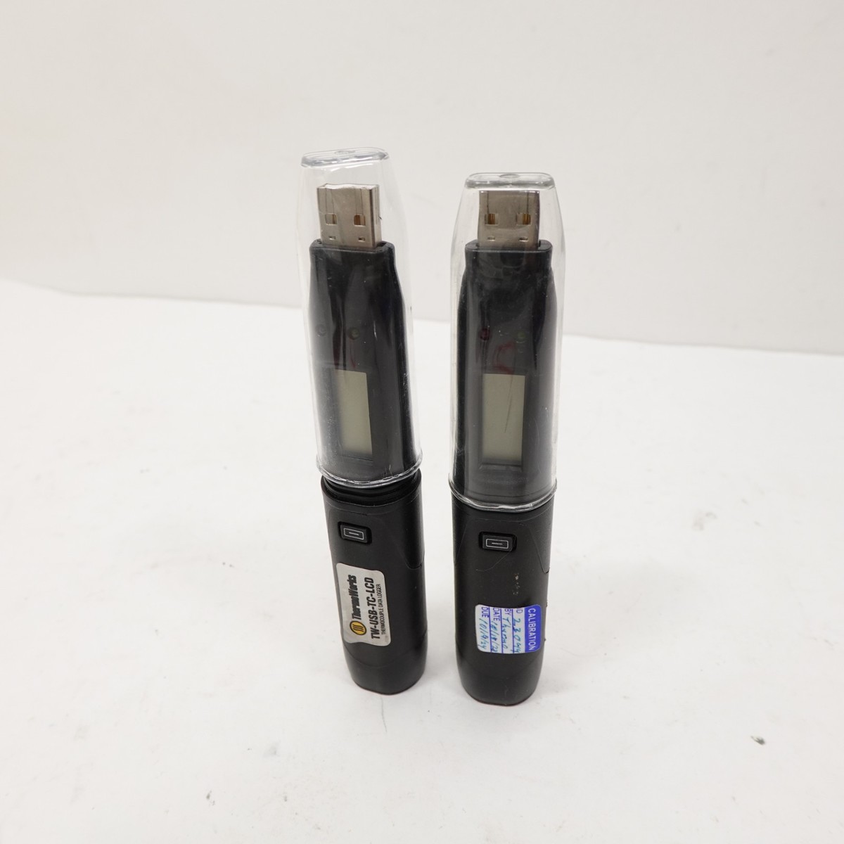 Includes both units shown, each with protective USB caps. Both units have visible calibration stickers and LCD displays. No additional accessories or software included.