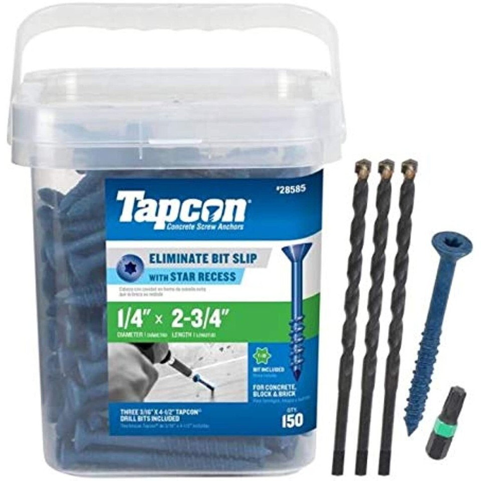 As the original concrete screw anchor that revolutionized the construction world, Tapcon brand concrete anchors deliver the ease of use, superior precision and the unparalleled performance that professionals demand. With a new star recess to eliminate bit slip, Tapcon drives with ease and the patented thread design allows for quick and successful installation no matter the type masonry substrate anchored into. Use Tapcon concrete screw anchors for wood framing to concrete, electrical equipment, furring strips and many other applications that require fastening into brick, block or concrete.