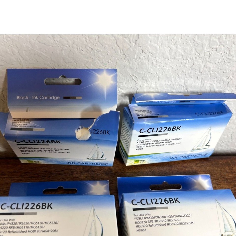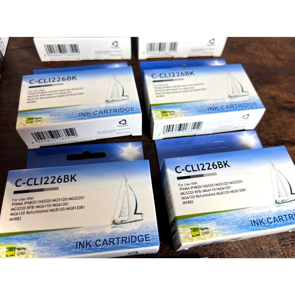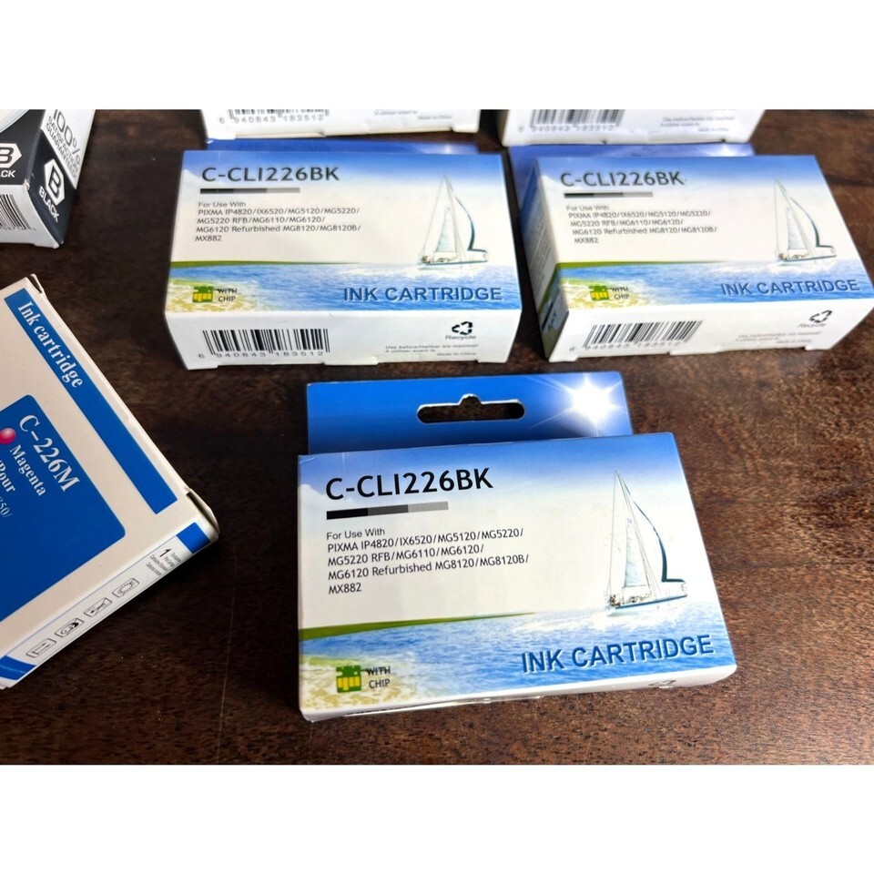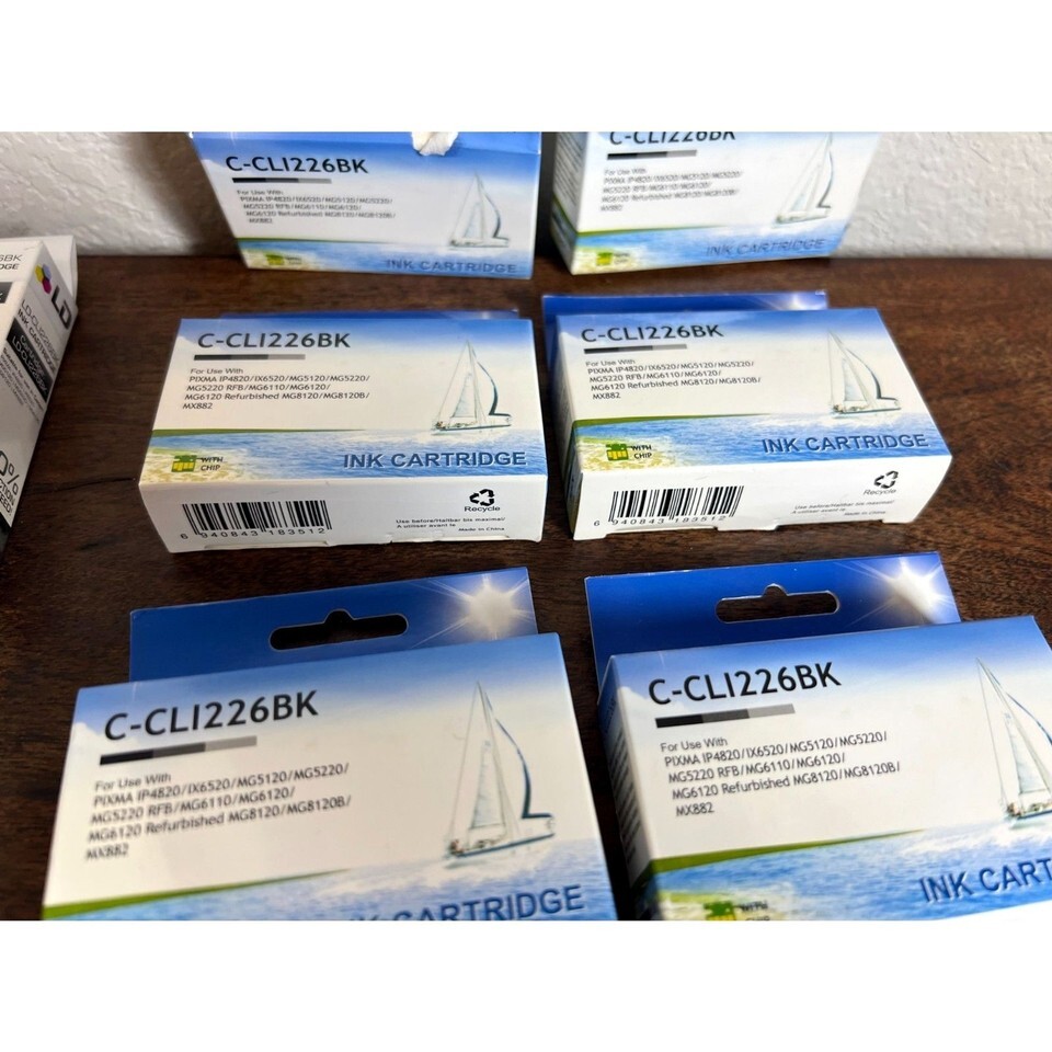 1) 13 Black - LD-CLI226BK - Exp 2016. For Pixma ip4820, ix6520, mg5120, mg5220, mg6120, mg8120, mx882. 2) C-CLI226BK. For Pixma ip4820, ix6520, mg5120, mg5220, mg5220 RFB, ,mg6110, mg6120, mg6120 Refurbished, mg8120, mg8120b, mx882. Has chip.?3) 3 Cyan - CA-226C - Exp 2015. Replaces CLI-226C, for use on Pixma IP 4820, ix 6520, MG (5120, 5220, 6120, 8120), MX 882. No chip. 4) Yellow CA-226Y - Exp 2014. For Pixma IP4810, IP4820, IX6520, MG5120, MG5220, MG5220 RFB, MG6110, MG6120, MG6120 Refurbished, MG8120, MG8120B, MX882. No Chip. 5) 1 Magenta For Pixma iP4850, iP4950, iX6550, MG 5150, 5250, 5350, 6150, 6250, 8150, MX 885.