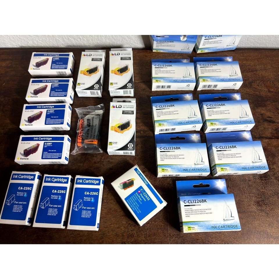 Listing includes a variety of ink cartridges. All made to work for a variety of Canon printers like the Pixma varieties. Some have electronic chips. Expiration dates all vary. Most are new in packaging. Some have damaged packaging and one has no packaging. Stored in a cool, dry place.