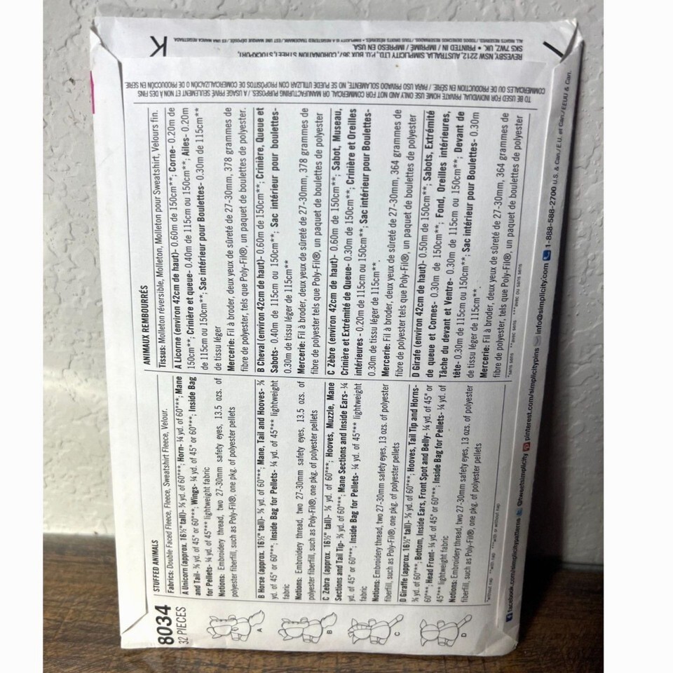 This listing is for one "Simplicity Stuffed Animal Sewing Pattern 8034 OS Giraffe Zebra Unicorn Horse NIB" from 2015 by Teacup Lion Designs.