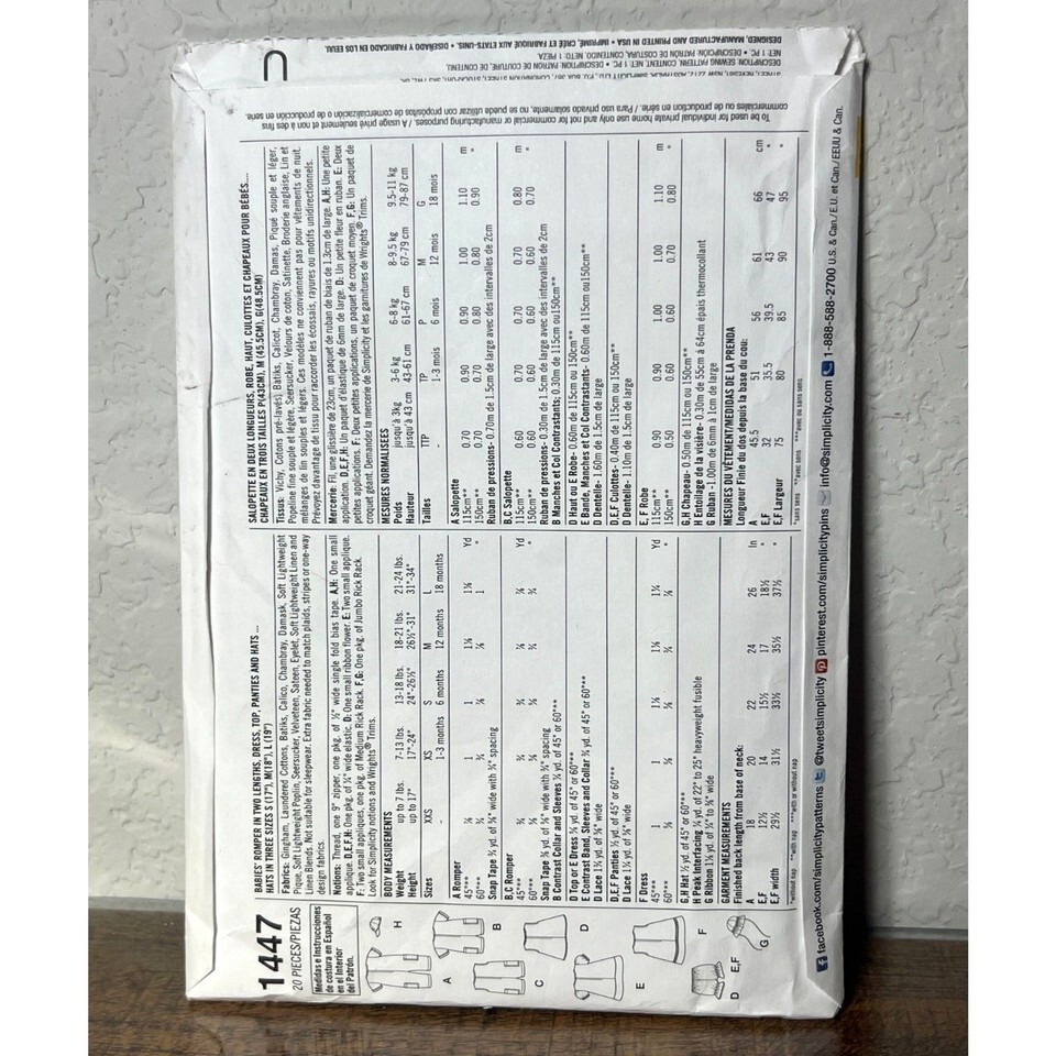 This listing is for one sewing pattern package "Simplicity 1447A Babies Romper Dress Top Panties Hats Sewing Pattern Uncut XXS-L" from 2014.