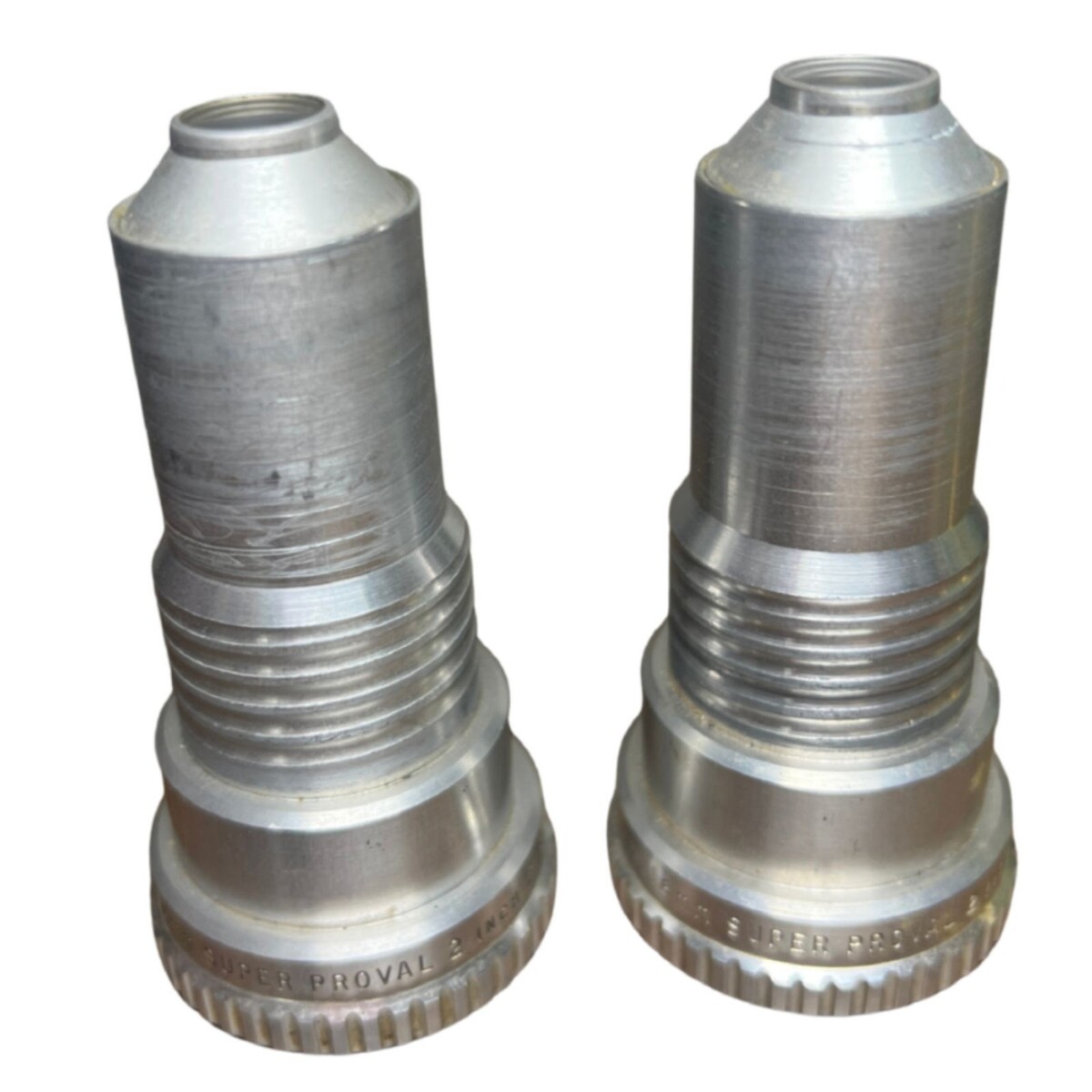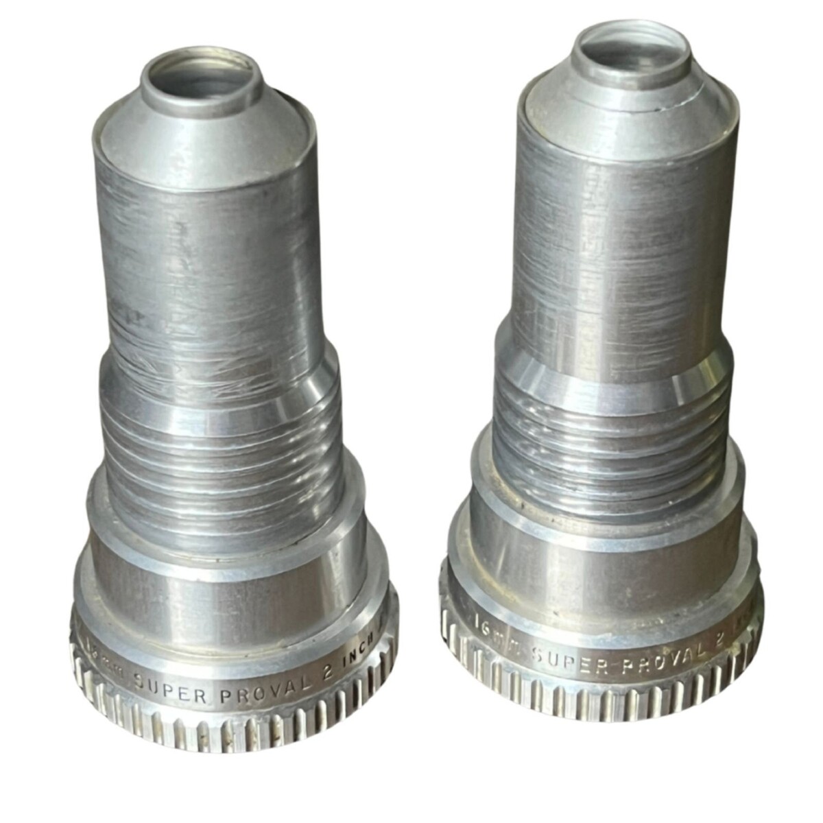 Pair of vintage Bell Howell Super Proval 2-inch, 16mm, f/1.6 projection lenses, precision-made in the USA and designed for film projector or optical equipment use. These solid aluminum-body lenses have a clean industrial look and quality machining typical of mid-century American optical manufacturing. Great for collectors, projector restoration, or repurposing into custom optics or photography projects.