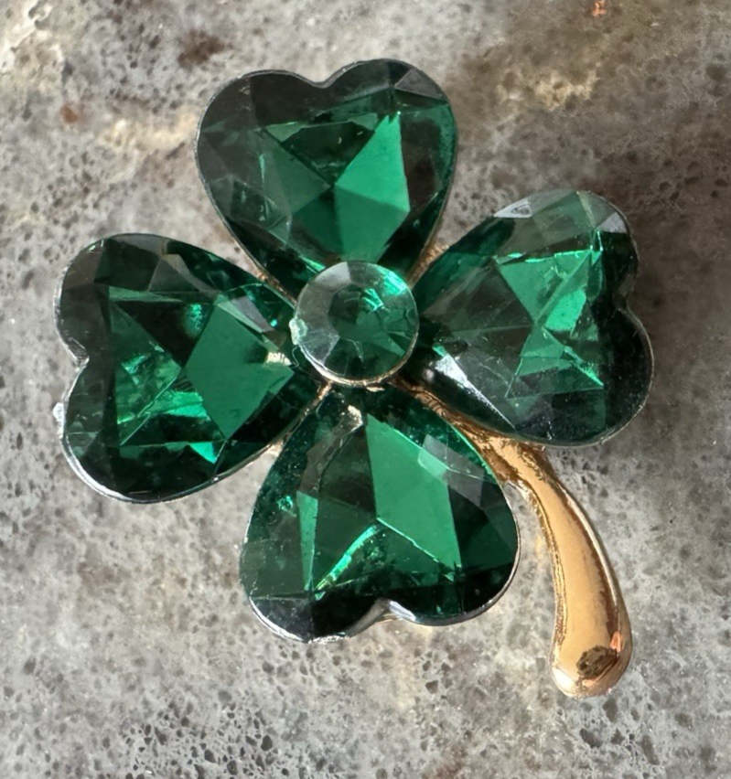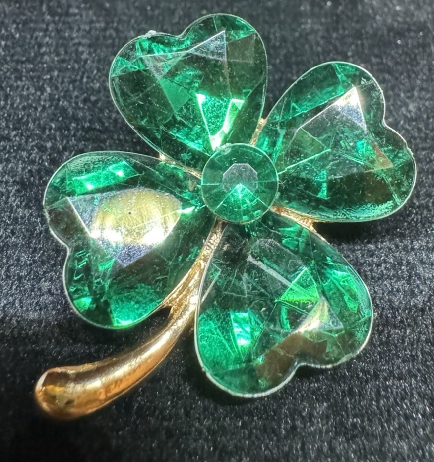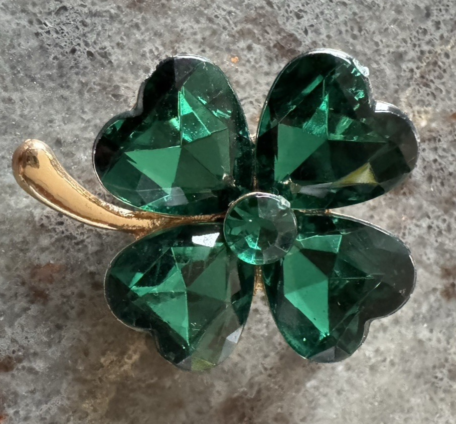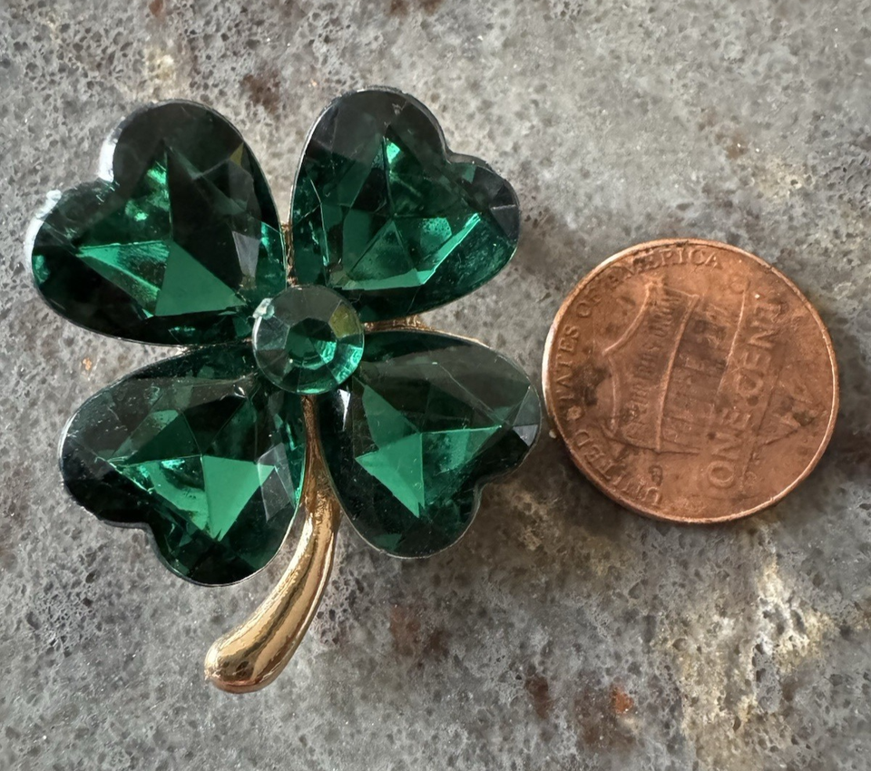 Vintage St Patrick’s Day Shamrock Brooch Green Faceted Rhinestone Gold Tone Pin