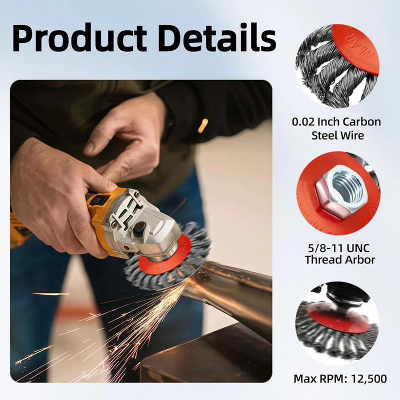 SPECIFICATION: 0.02? carbon steel twisted wires, 4? width wheel brush, universal 5/8-11? threaded arbor, MAX RPM 12,500. 5 Pack wheel brushes.