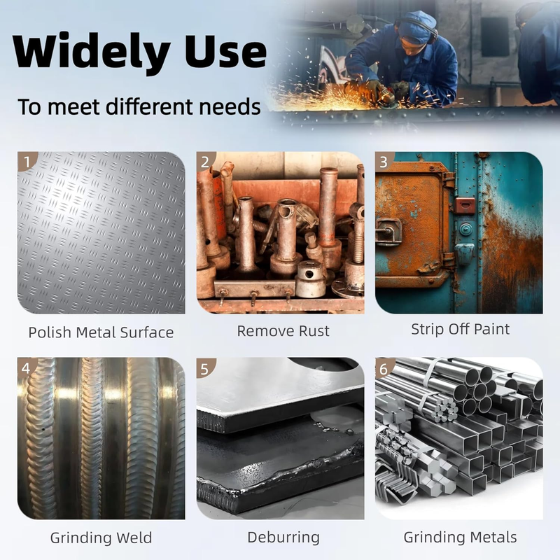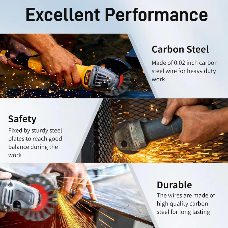 SAFETY AND RELIABILITY: The wheel brush is made of strengthen steel and large hexagonal threaded arbor to prevent the wire breaking and falling during the process of the heavy work.